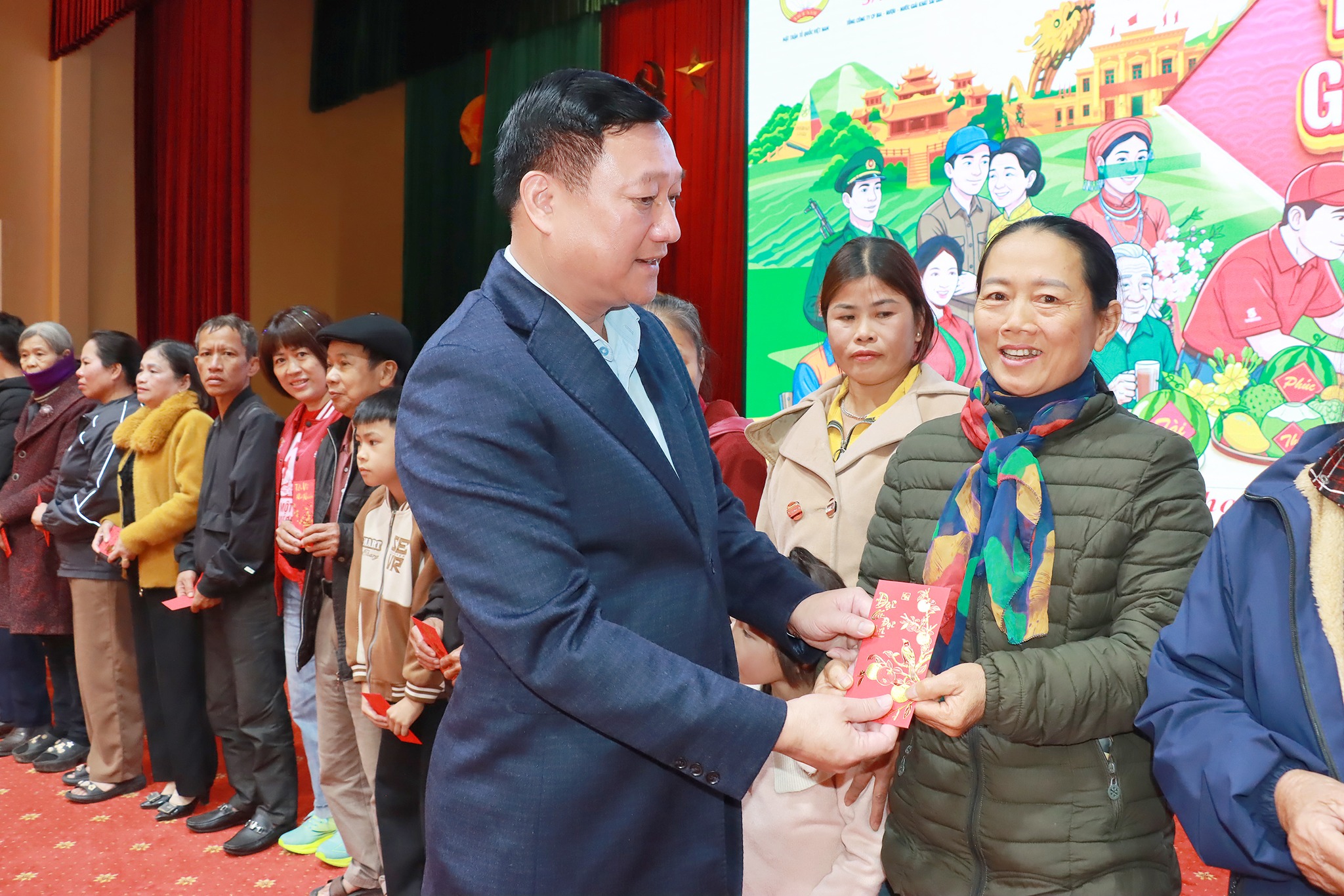 Các đồng chí lãnh đạo trao từng phần quà đến bà con nhân dân.