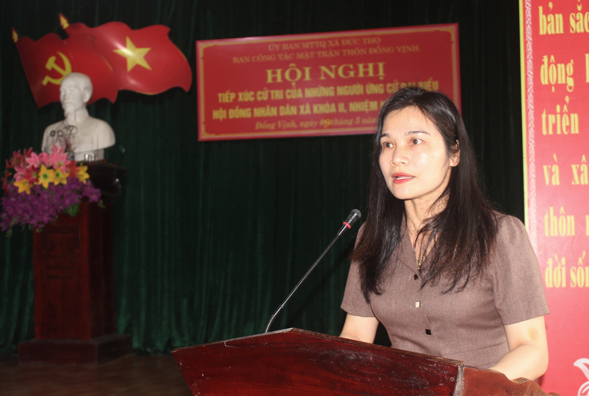 Ứng cử viên Phạm Thị Thiệp - Hiệu trưởng trưởng mầm non Đức Lập trình bày dự kiến chương trình hành động của bản thân.