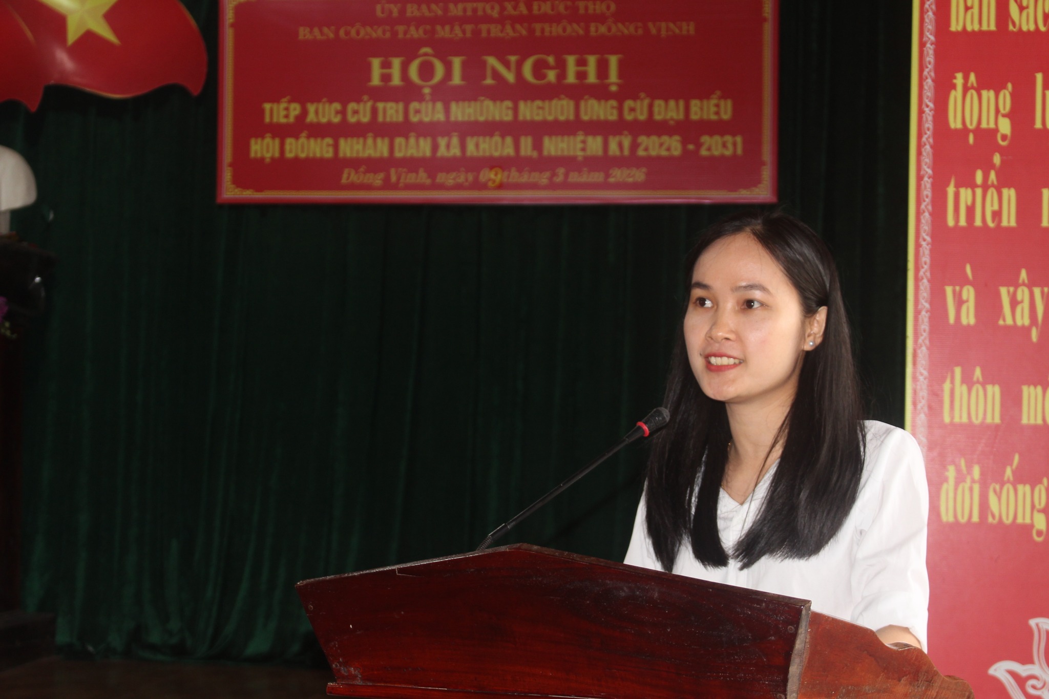 Ứng cử viên Thái Thị Thu Thủy- Ủy viên BTV- Chủ nhiệm Ủy ban kiểm tra Đảng ủy xã, trình bày dự kiến chương trình hành động của bản thân.