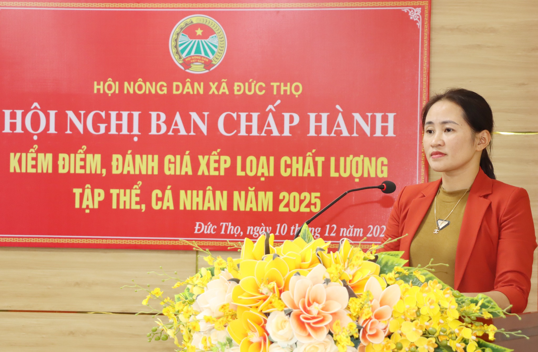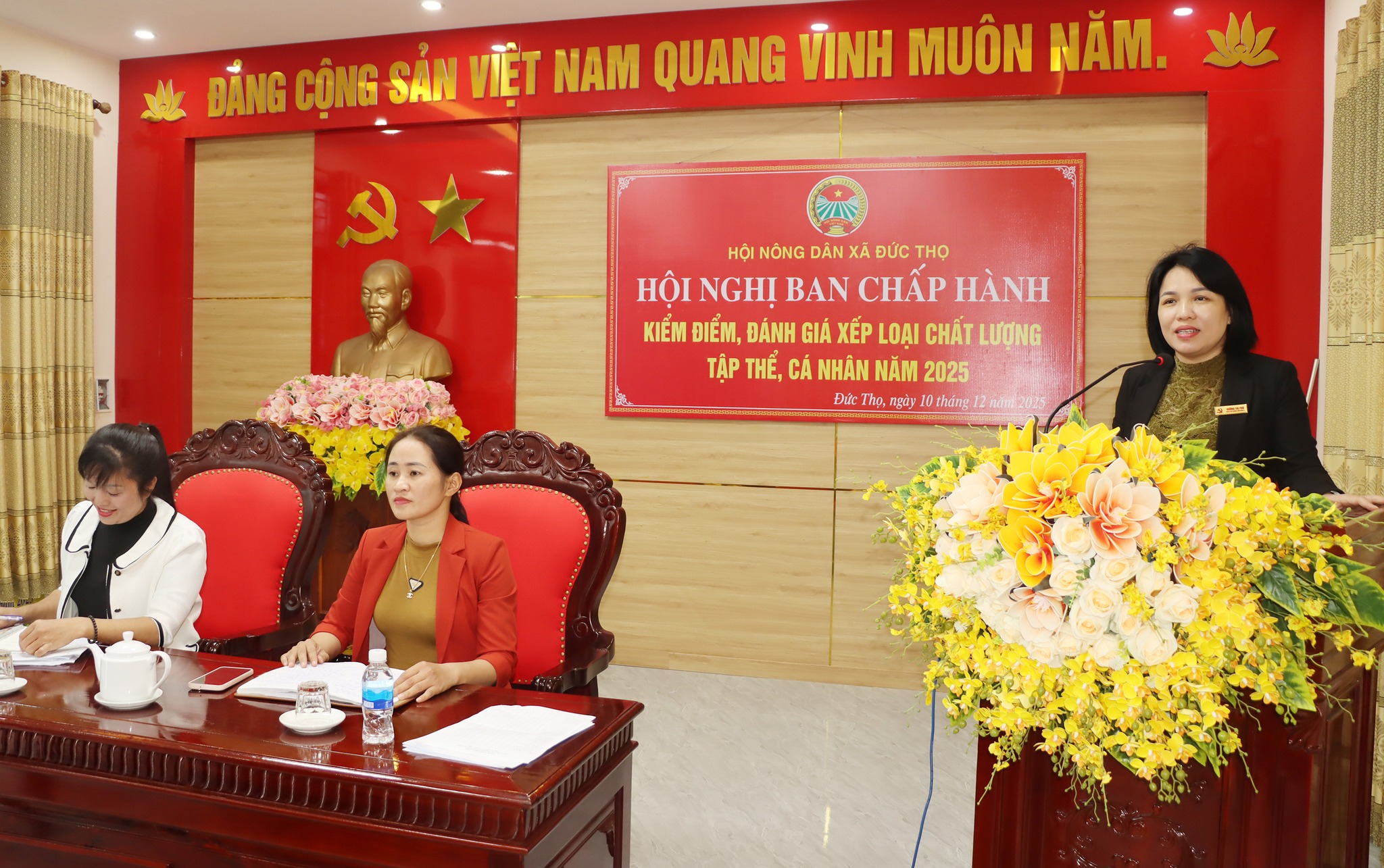 Phó Chủ tịch HND xã Nguyễn Thị Hồng Thuận thông qua chương trình và trình bày dự thảo Báo cáo kiểm điểm tập thể ban chấp hành lãnh đạo quản lí
