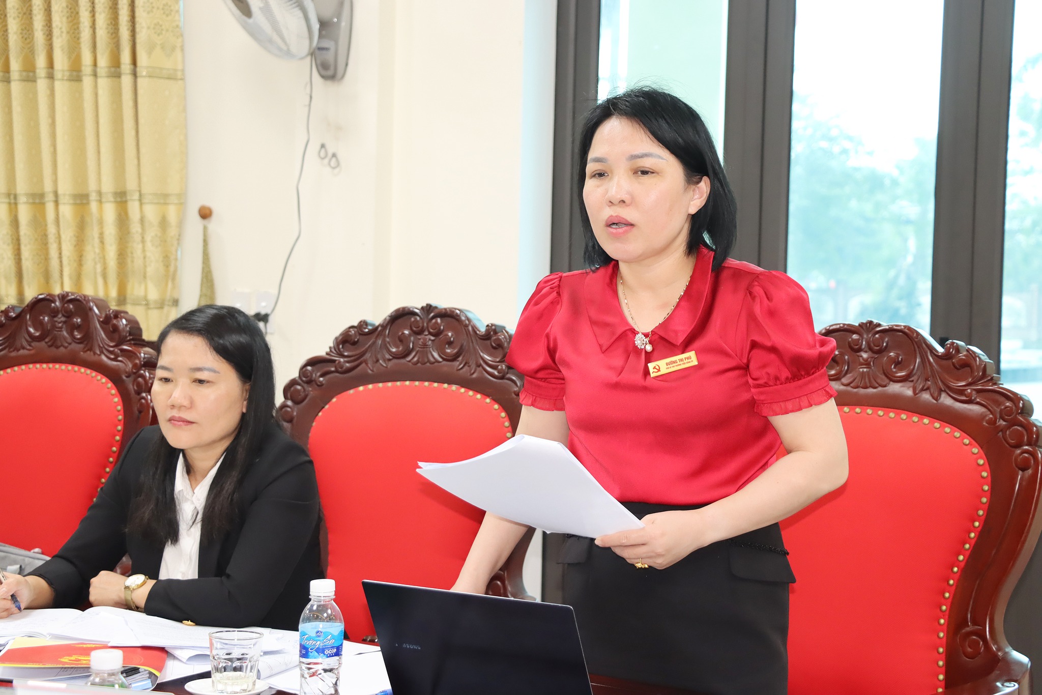 Đồng chí Đường Thị Phú - Phó Bí thư TT Đảng ủy xã phát biểu tại cuộc họp.