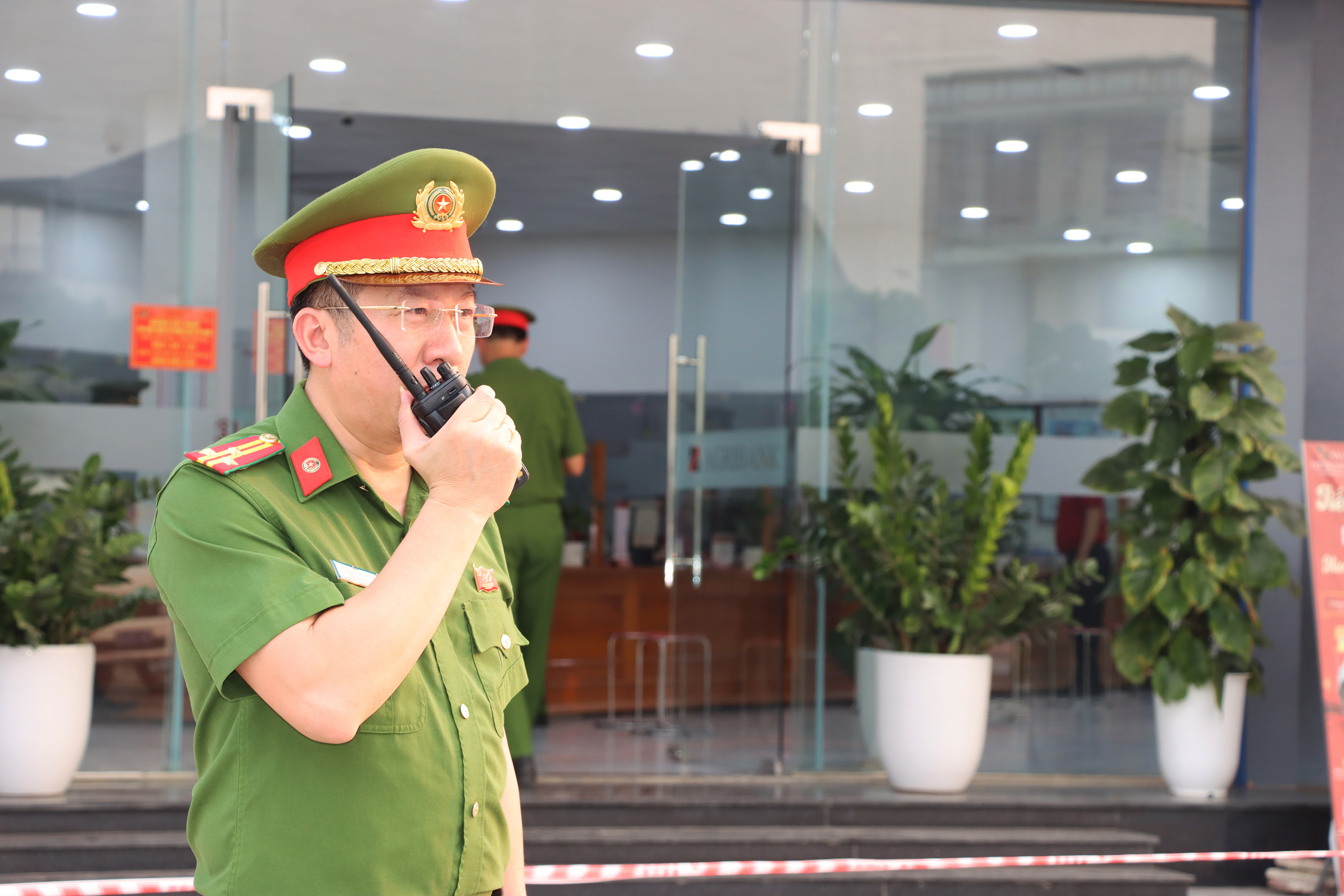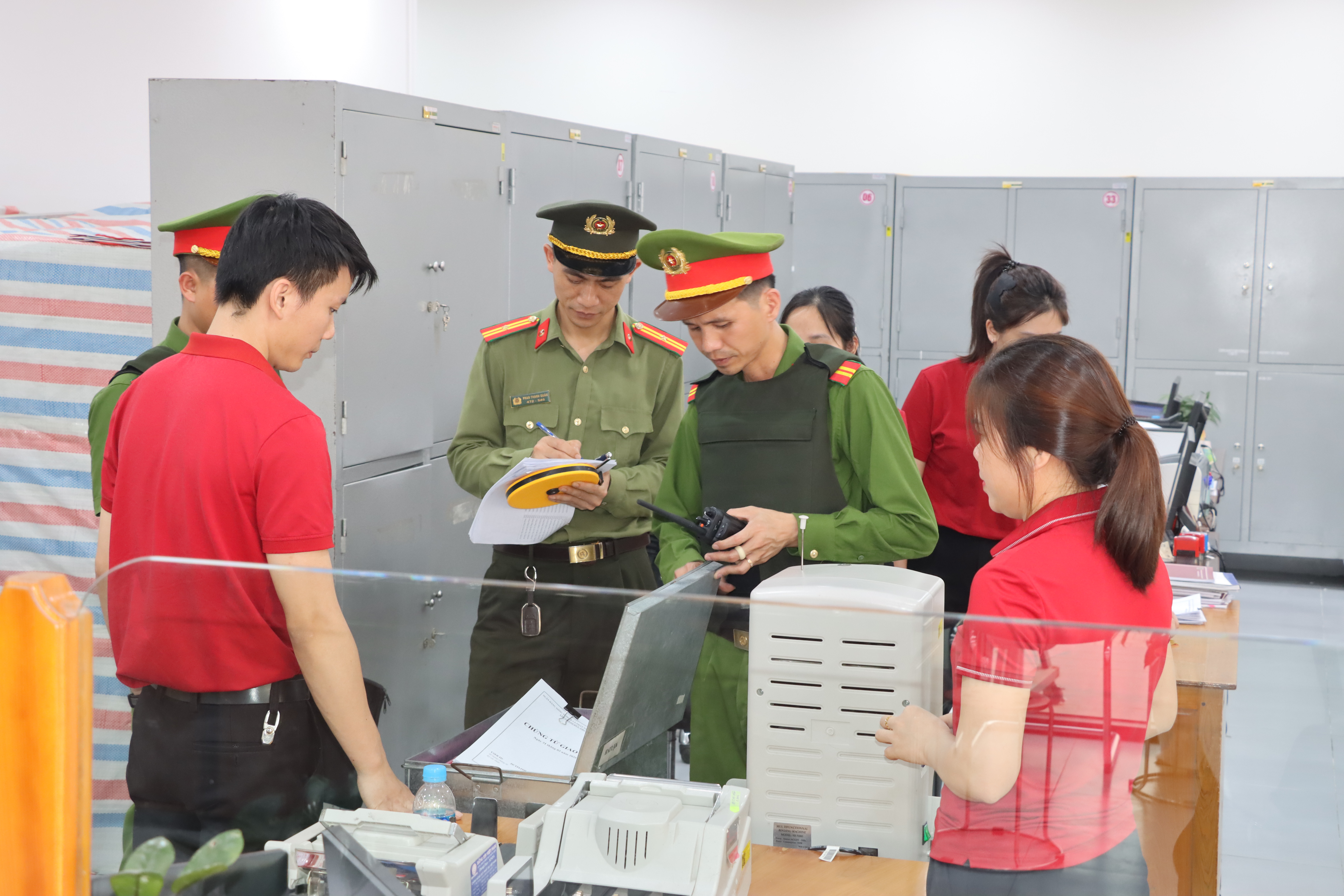 Theo kịch bản diễn tập, vào lúc16h30’ cùng ngày, hai đối tượng đội mũ xe máy, mặc áo chống nắng, đeo khẩu trang trùm kín mặt, lưng đeo ba lô điều khiển xe máy lượn lờ quanh khu vực Phòng giao dịch. Sau đó, các đối tượng đỗ xe sai quy định trước khuôn viên nhà làm việc, mặc dù bảo vệ phòng giao dịch ngân hàng đã nhắc nhở 2 đối tượng tháo khẩu trang nhưng 2 đối tượng không nghe và đã xông vào bên trong, hô hoán, đe nạt sử dụng dao và súng uy hiếp cán bộ, nhân viên, bảo vệ nhằm thực hiện hành vi cướp tiền.