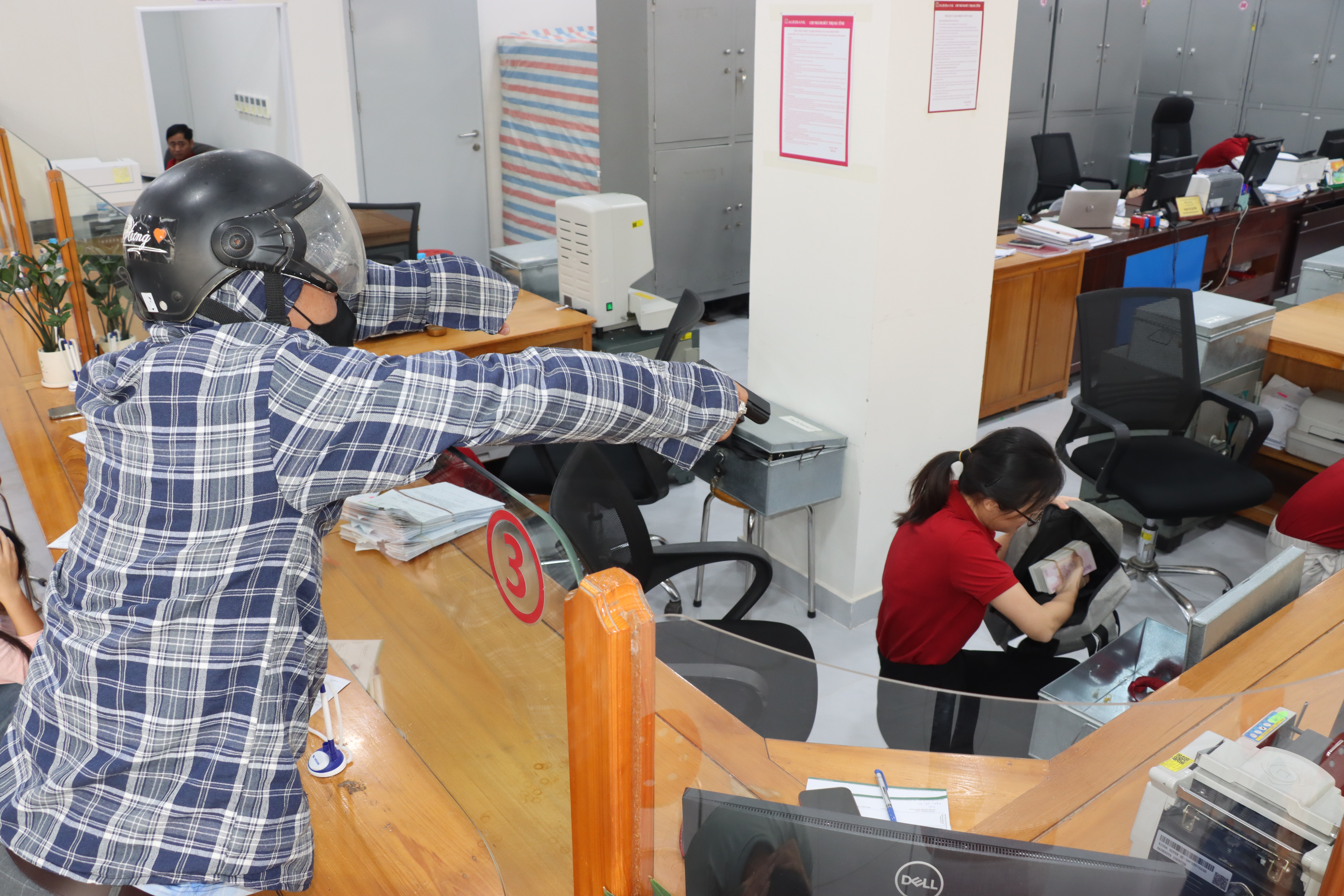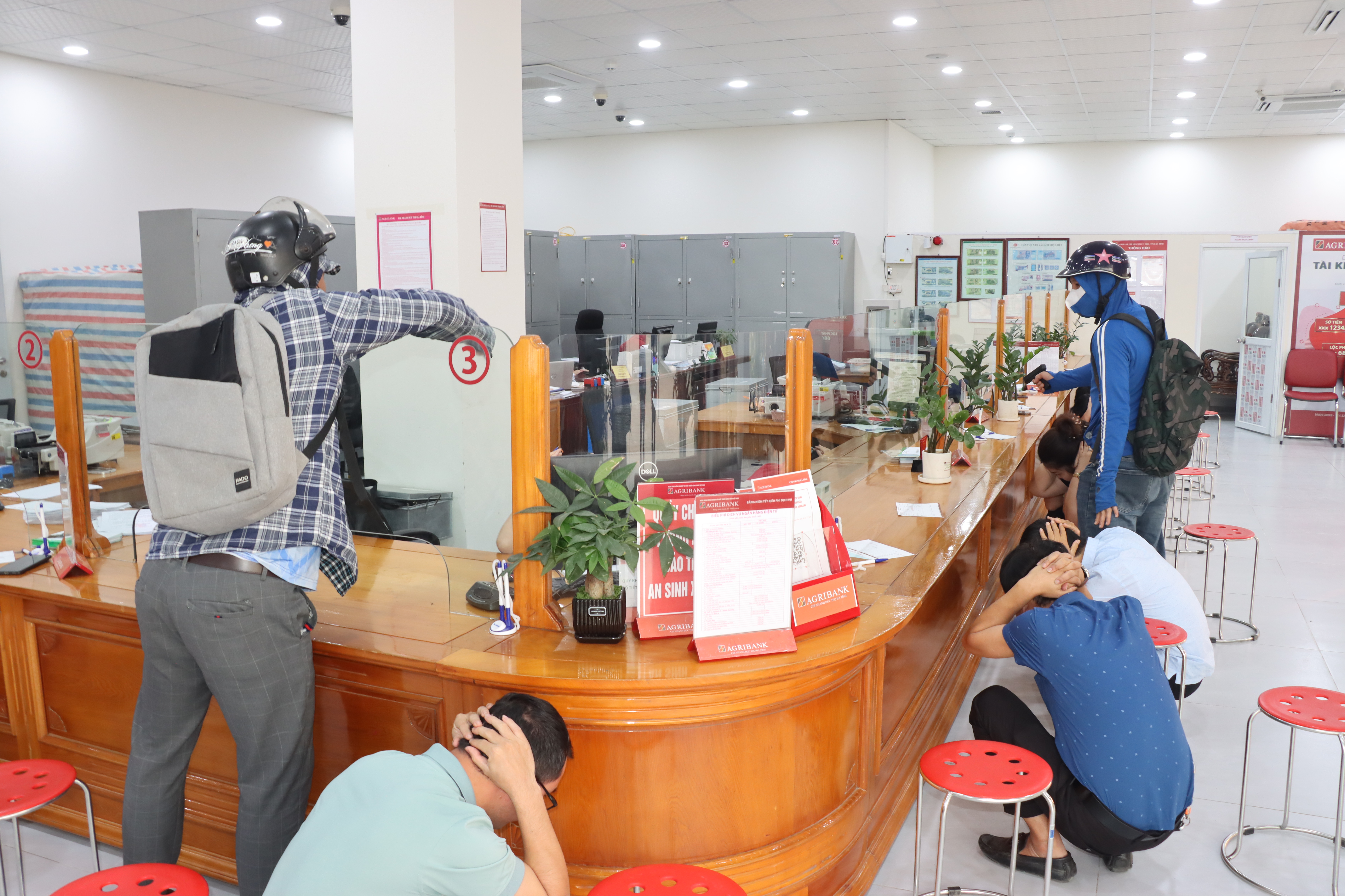 Tình huống giả định 2 tên cướp vào ngân hàng dùng vũ khí khống chế bảo vệ ngân hàng và nhân viên giao dịch cướp tiền