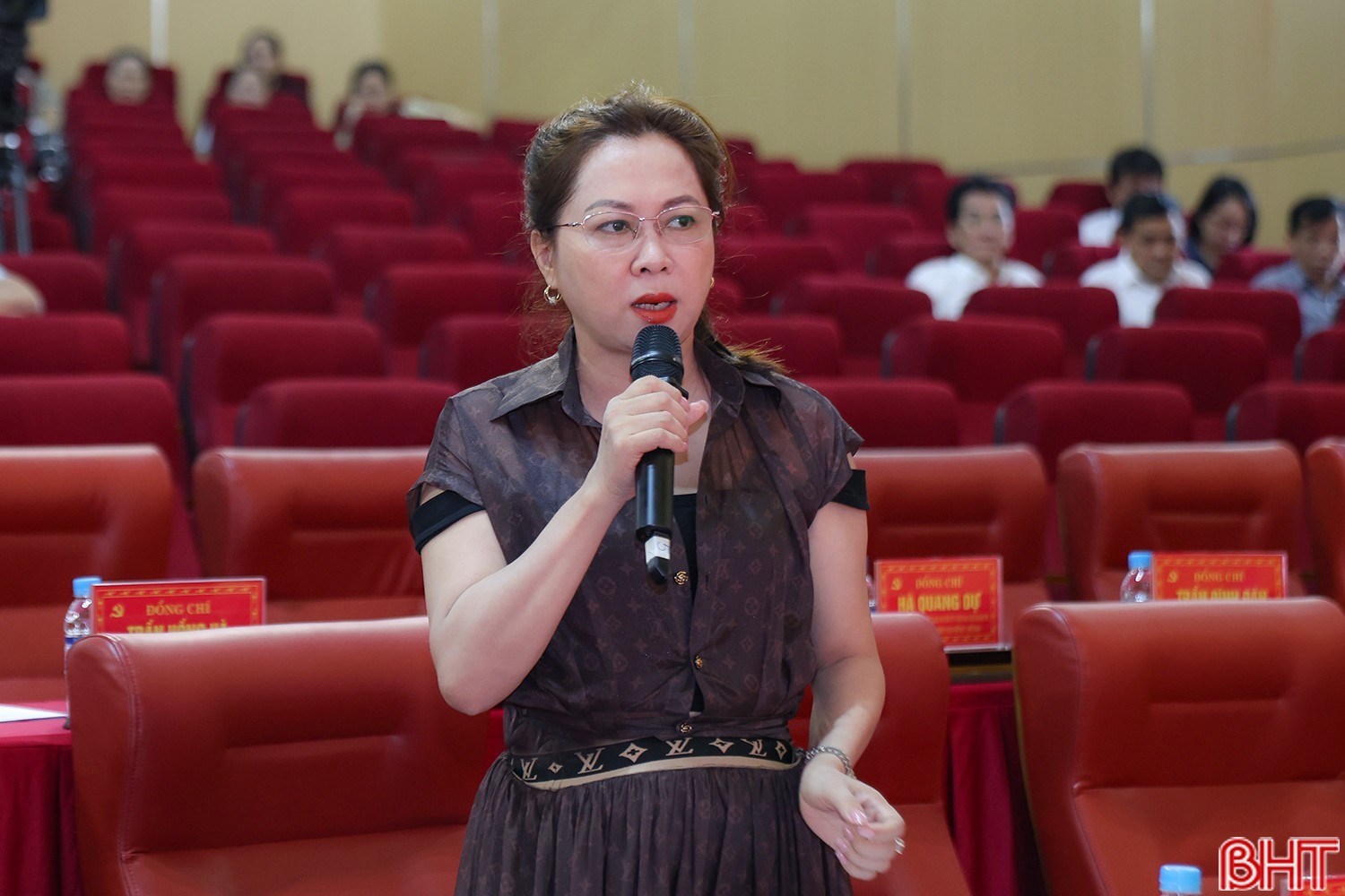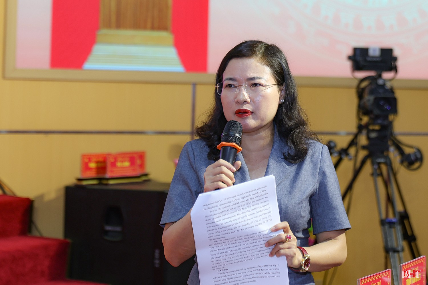 Nhà báo Trần Thị Phương Hoa - Phó Giám đốc Báo và phát thanh, truyền hình Hà Tĩnh góp ý một số nội dung.