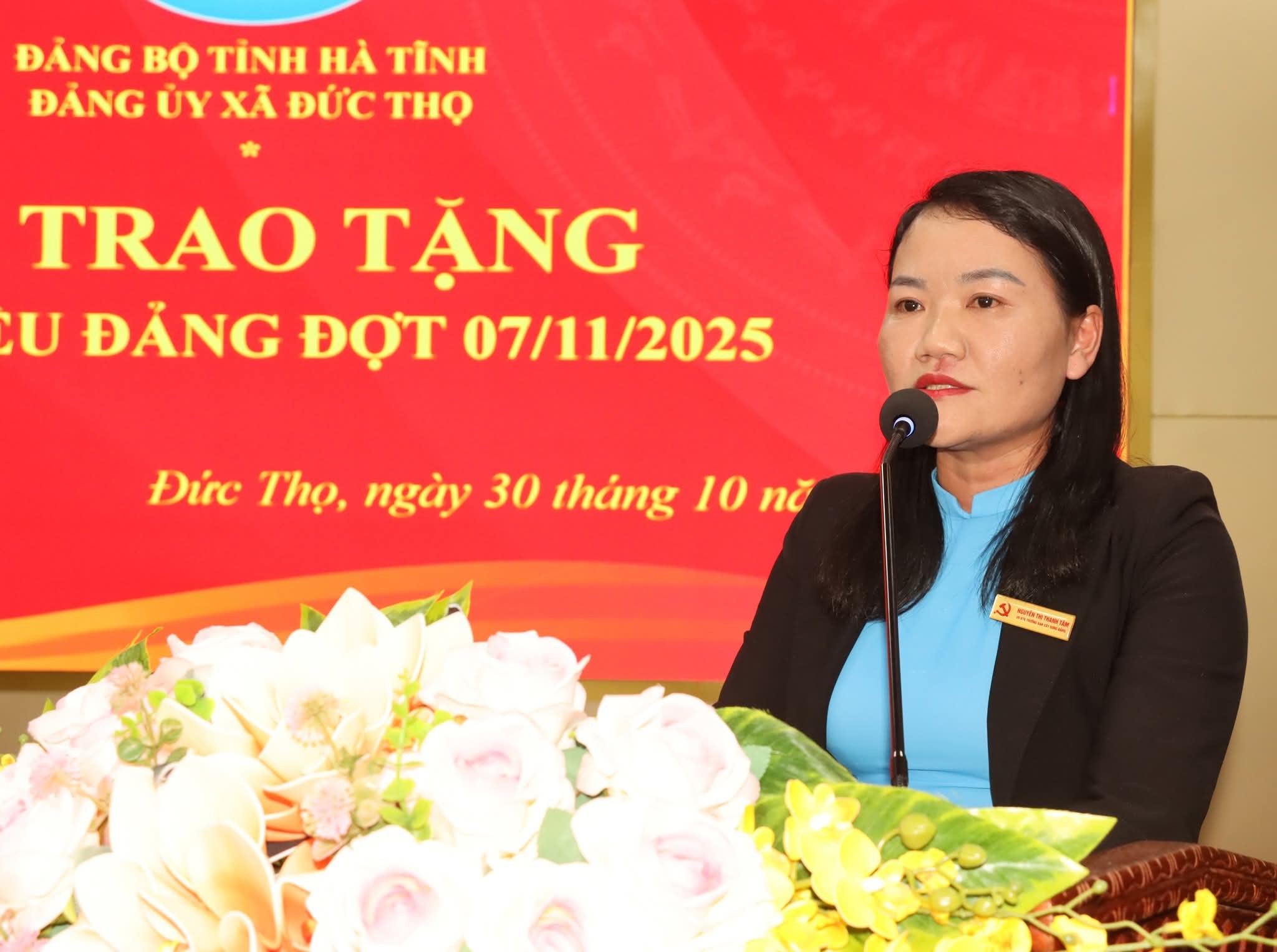 Thay mặt Ban Thường vụ Đảng ủy, Phó Bí thư Thường trực Đảng ủy xã Đức Thọ, Đường Thị Phú khẳng định, Huy hiệu Đảng là sự ghi nhận, tôn vinh của Đảng, Nhà nước và Nhân dân đối với những cống hiến, đóng góp to lớn của các đảng viên cho sự nghiệp cách mạng của dân tộc. Cũng nhân dịp này đồng chí gửi lời tri ân sâu sắc đến các đảng viên cao niên – những “cây cao bóng cả” luôn kiên trung, gương mẫu, cống hiến thầm lặng cho sự nghiệp của Đảng. Đồng thời bày tỏ mong muốn các đồng chí đảng viên tiếp tục phát huy vai trò tiên phong, nêu gương sáng, kiên định lập trường, giữ gìn phẩm chất đạo đức cách mạng, tích cực tuyên truyền, vận động gia đình và Nhân dân thực hiện tốt chủ trương, đường lối của Đảng, chính sách pháp luật của Nhà nước và quy định của địa phương