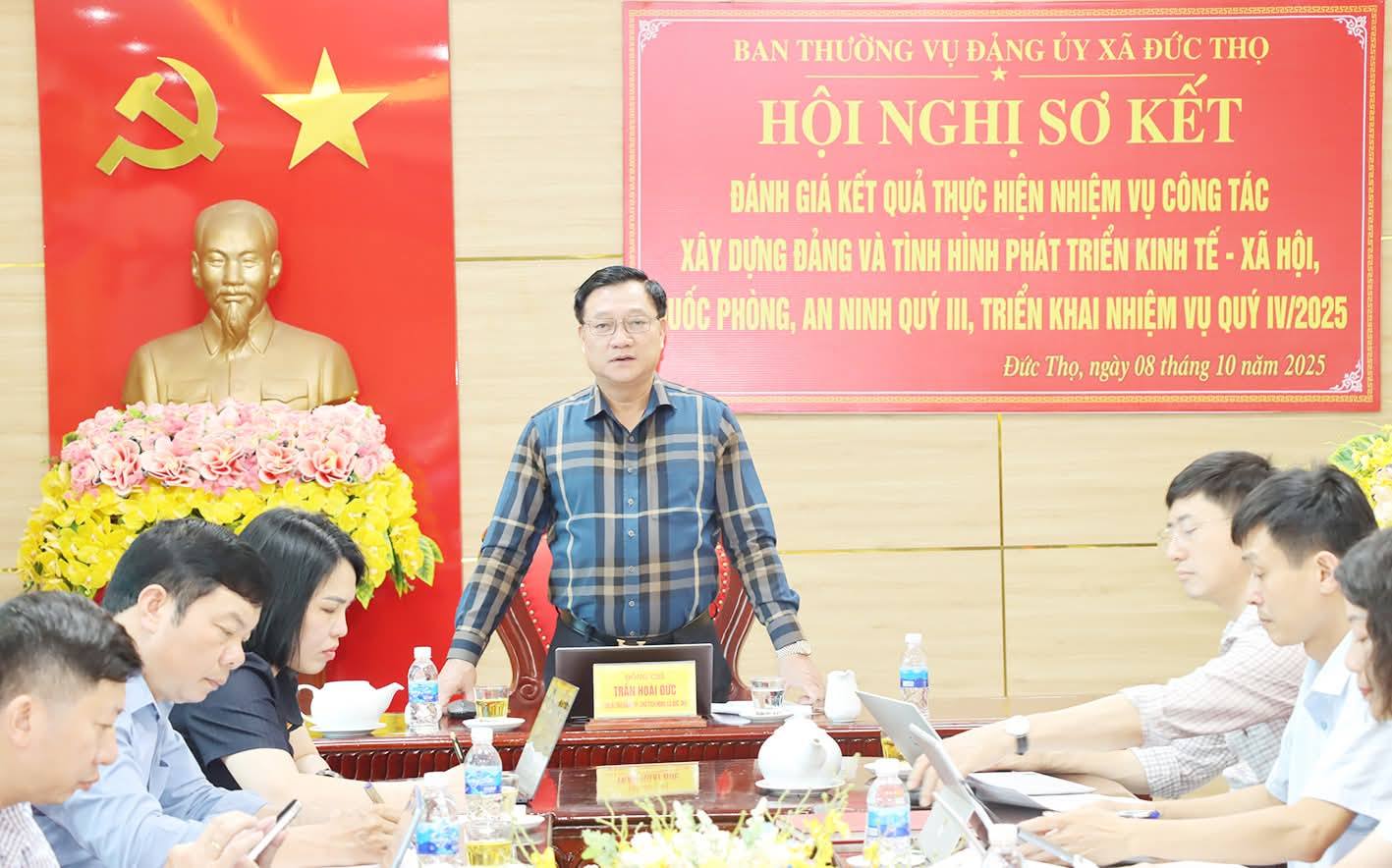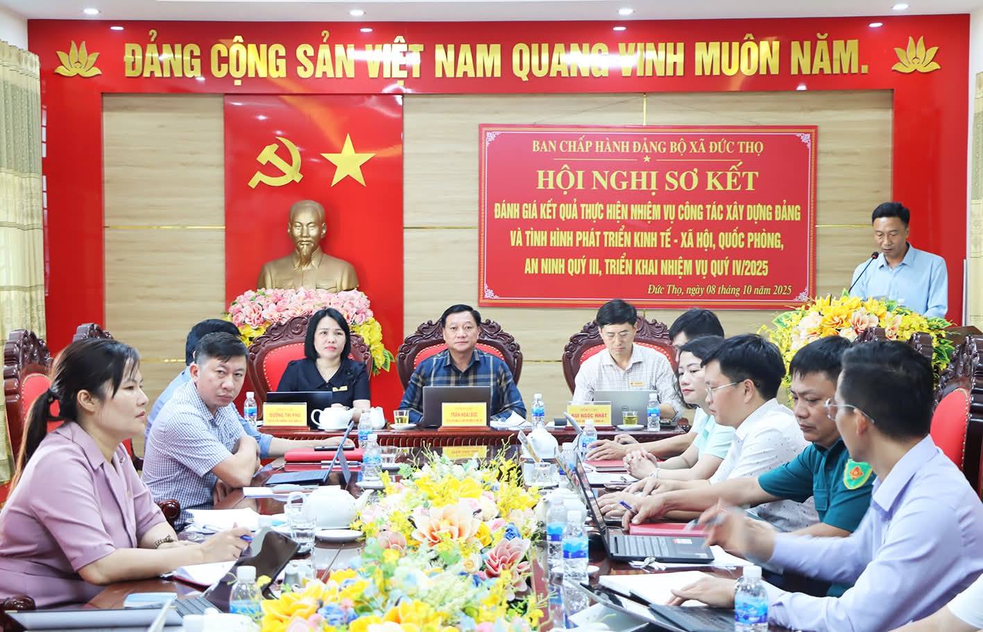 Chiều nay ngày 08/10/2025, Ban Thường vụ, Ban Chấp hành Đảng ủy xã Đức Thọ tổ chức Hội nghị sơ kết kết quả công tác xây dựng Đảng, tình hình kinh tế - xã hội, quốc phòng - an ninh quý III, đồng thời bàn các giải pháp trọng tâm thực hiện nhiệm vụ quý IV năm 2025.
