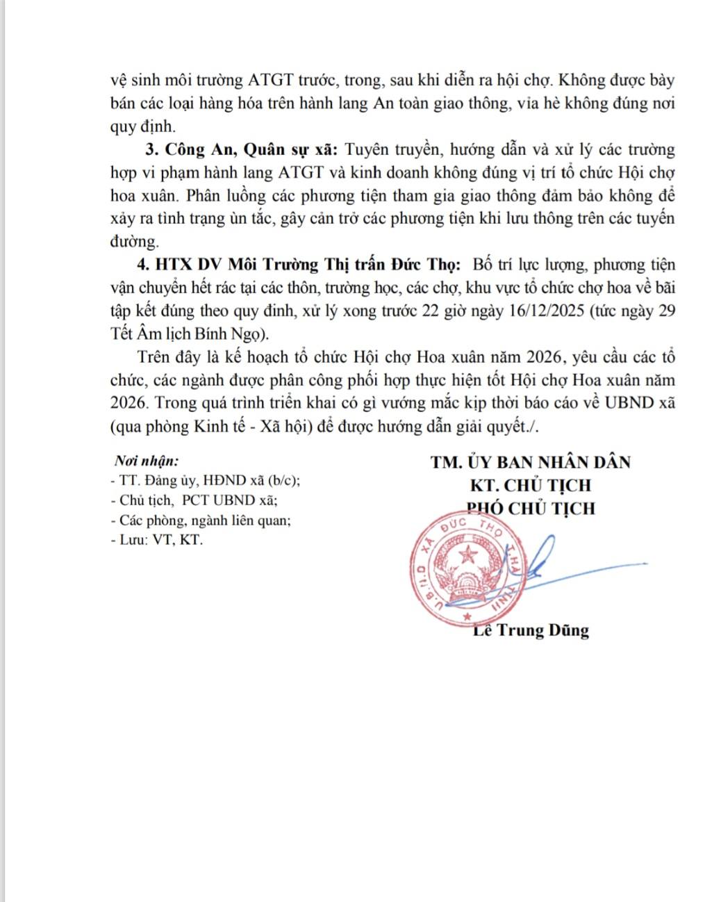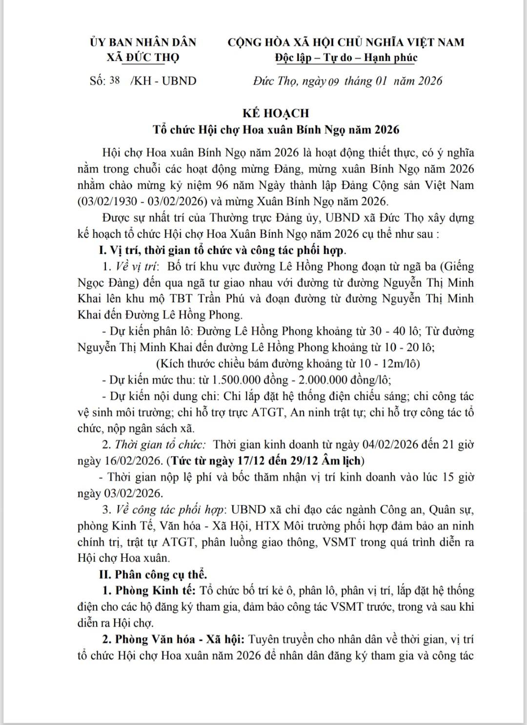 Thực hiện chuỗi hoạt động mừng Đảng – mừng Xuân Bính Ngọ 2026, chào mừng 96 năm Ngày thành lập Đảng Cộng sản Việt Nam (03/02/1930 – 03/02/2026), UBND xã Đức Thọ tổ chức Hội chợ Hoa Xuân Bính Ngọ năm 2026 với các nội dung chính: