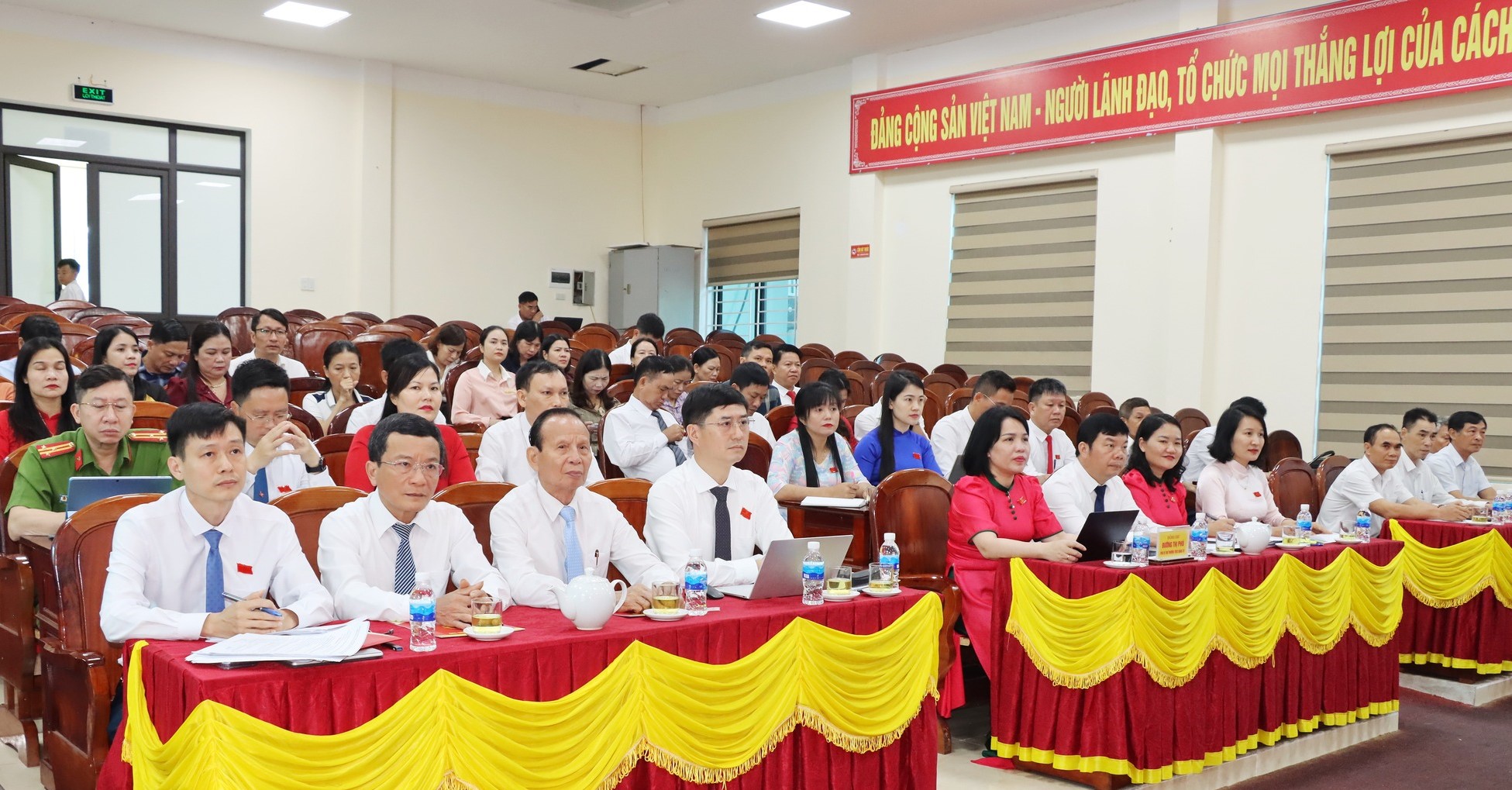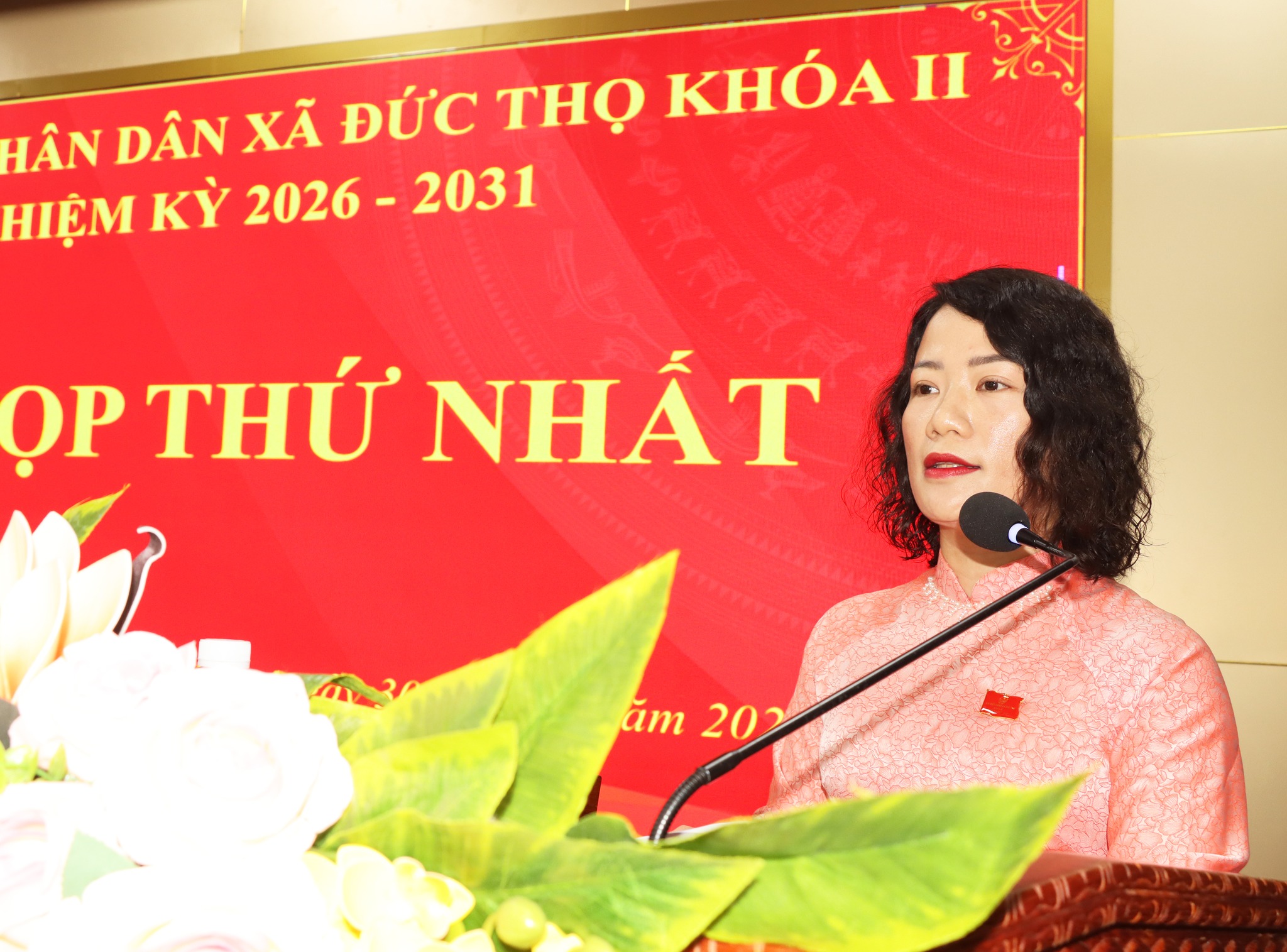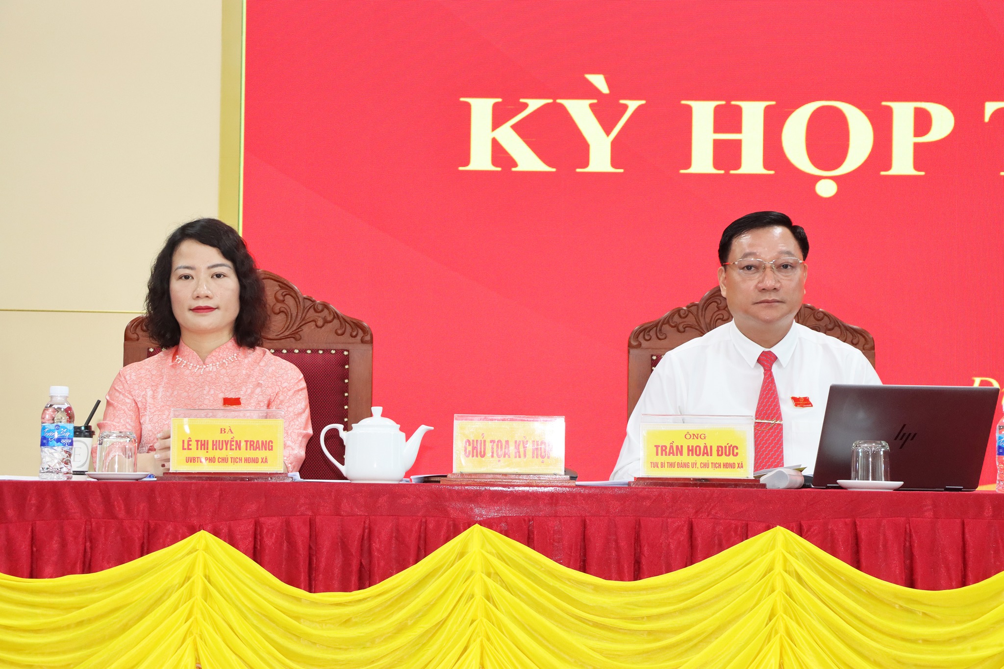 Ông Trần Hoài Đức, Bí thư Đảng ủy, Chủ tịch HĐND xã, Bà Lê Thị Huyền Trang, Phó Chủ tịch HĐND xã khóa I chủ tọa kỳ họp.
