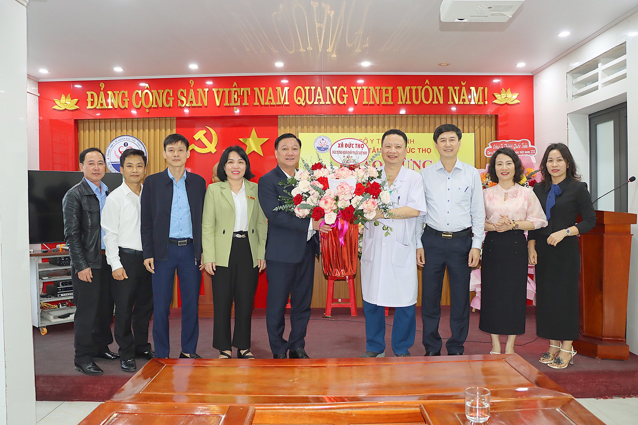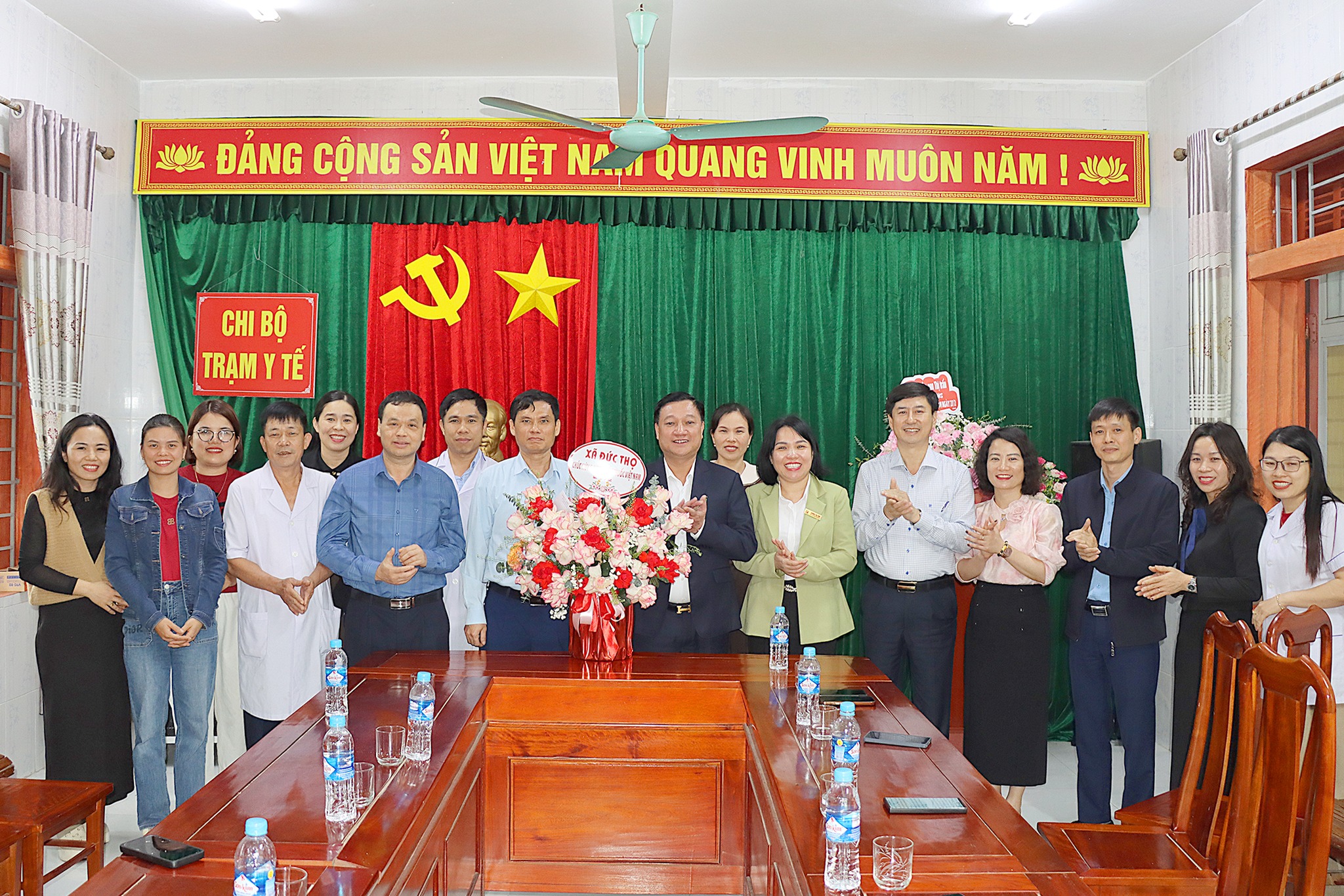 Các đồng chí lãnh đạo Đảng ủy, HĐND, UBND, UBMTTQ trao tặng lẵng hoa tươi thắm chúc mừng, gửi gắm niềm tin đến cán bộ, đội ngũ y, bác sỹ Trạm Y tế xã