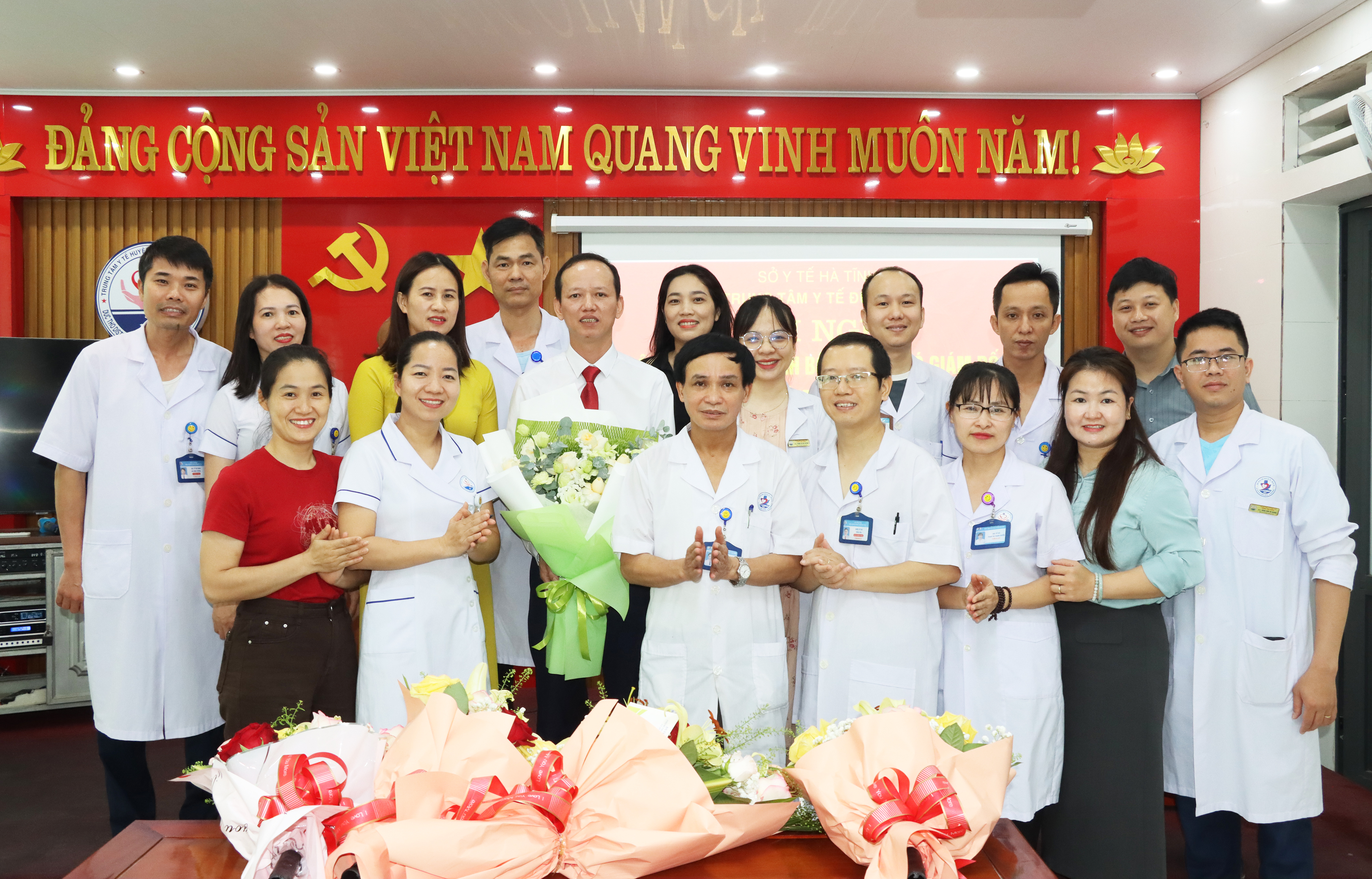 Cán bộ lãnh đạo, trưởng các phòng Trung tâm y tế Đức Thọ tặng hoa chúc mừng đồng chí Nguyễn Minh Đức .