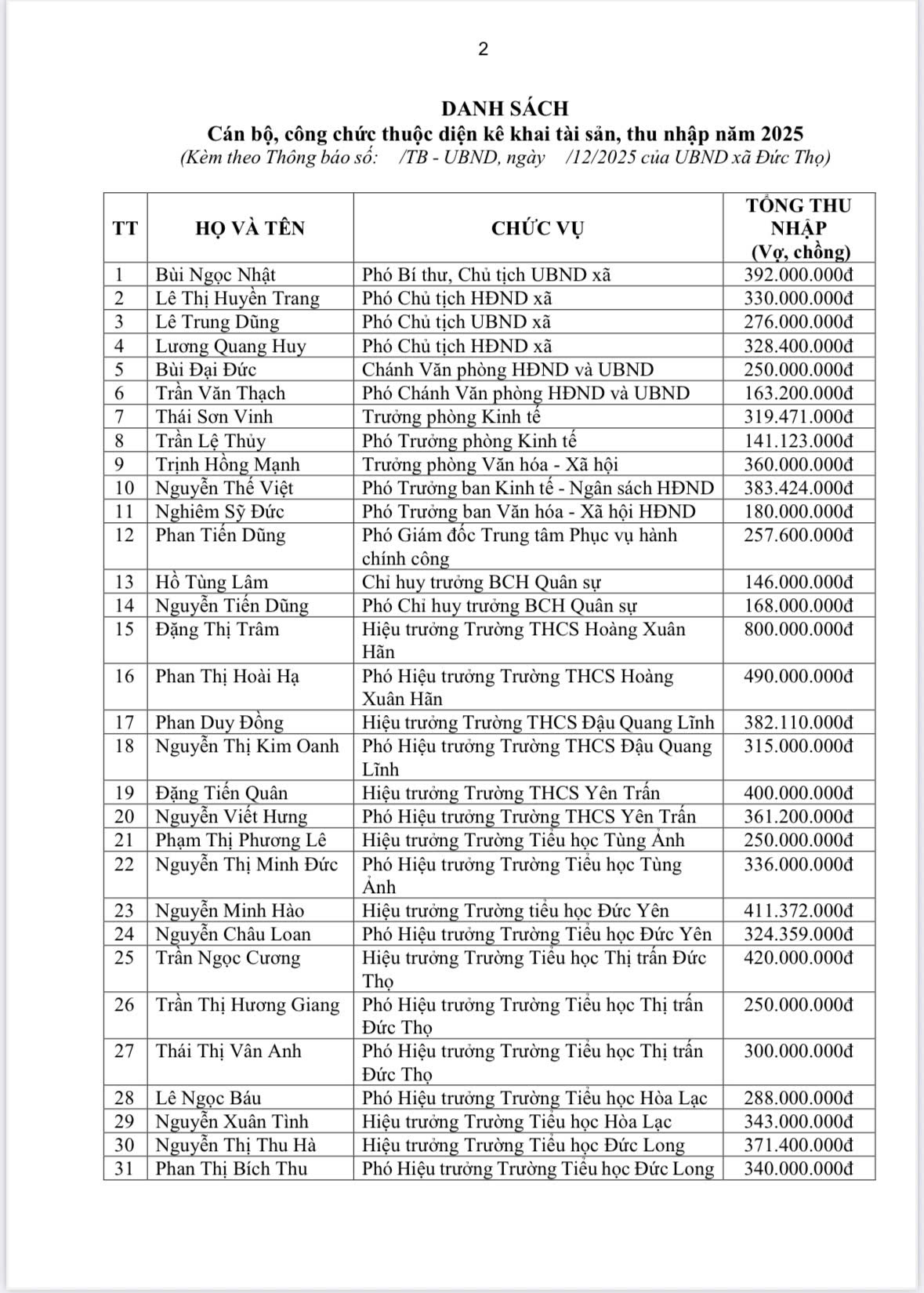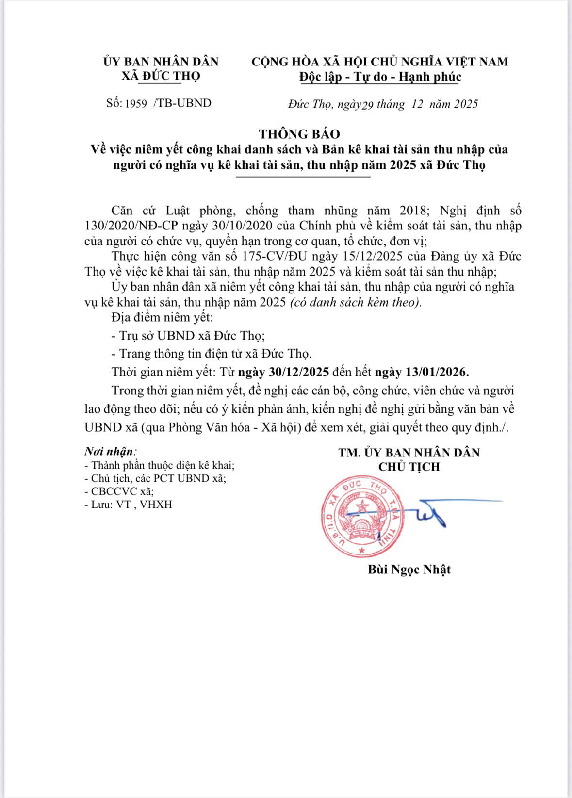 niêm yết công khai danh sách và Bản kê tài sản thu nhập của người có nghĩa vụ kê khai tài sản , thu nhập năm 2025 của xã Đức Thọ