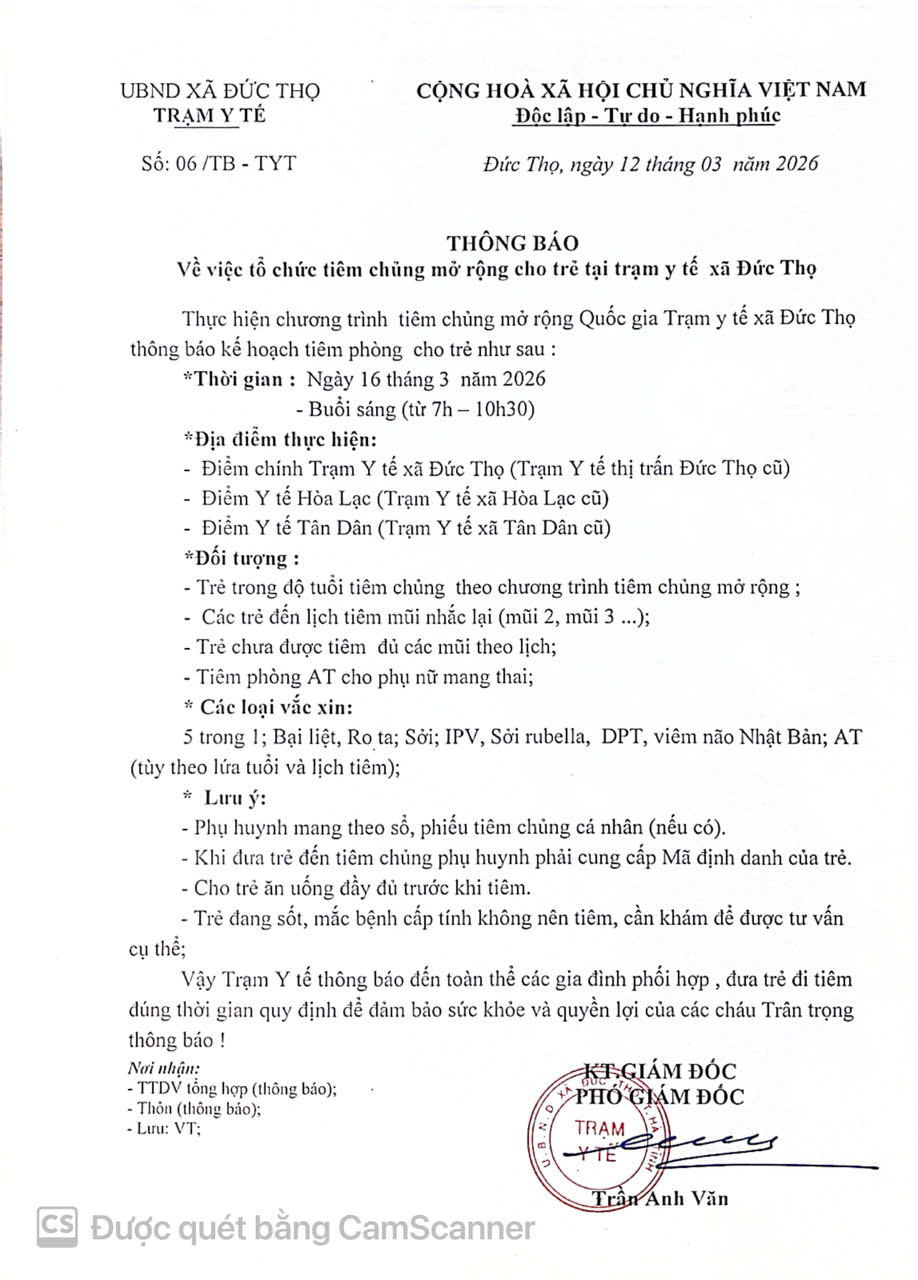 Thông báo về việc tiêm chủng mở rộng cho trẻ tại Trạm y tế xã Đức Thọ BBT16/03/2026A -A+BBT16/03/2026A -A+