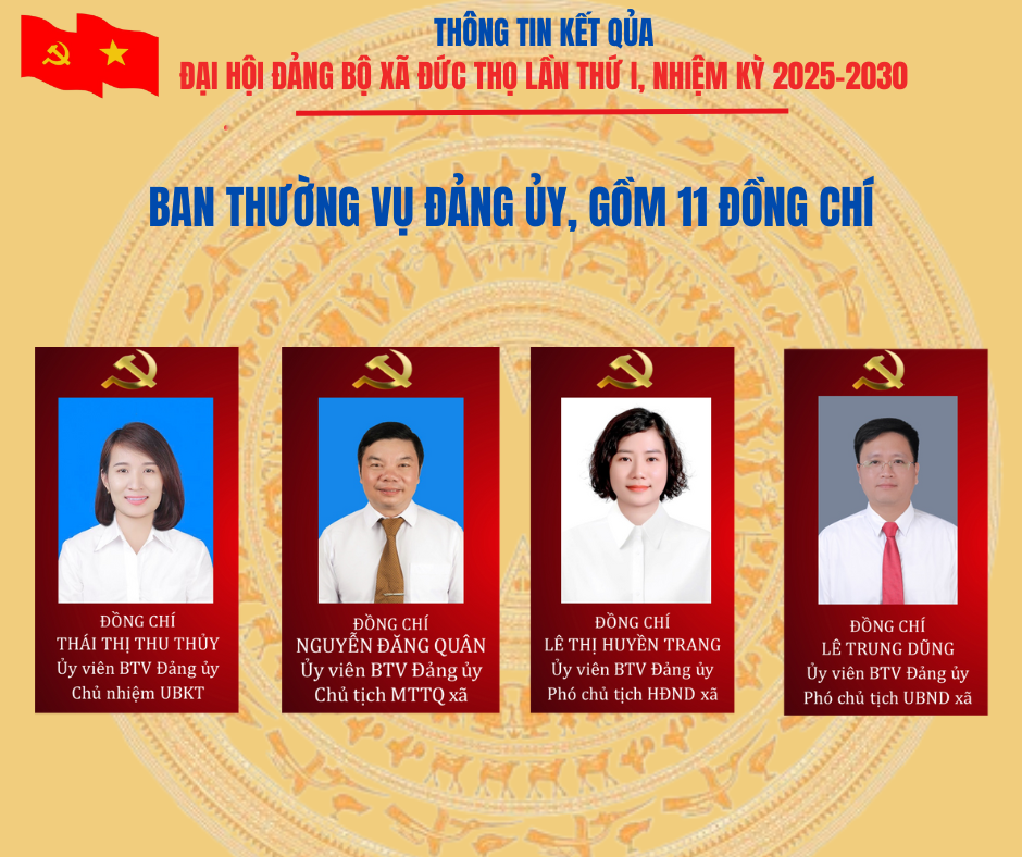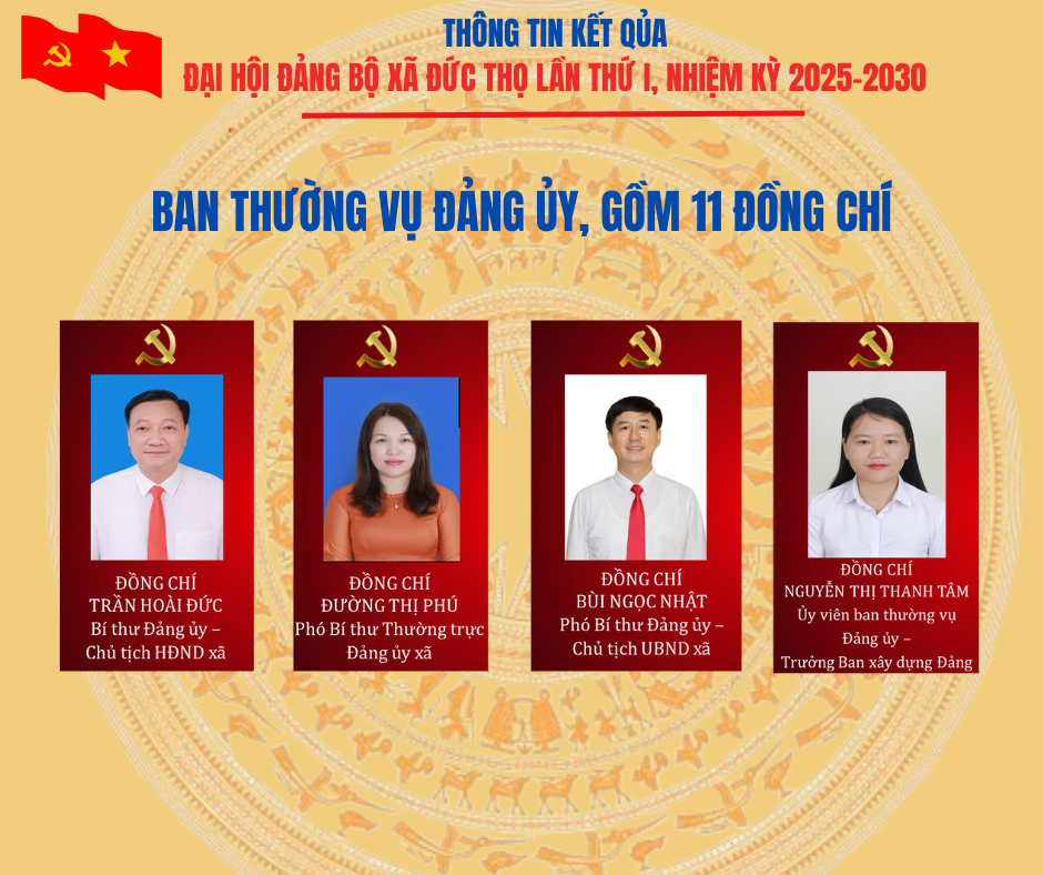 Tin liên quanTrung tâm Chính trị xã Đức Thọ phối hợp với Hội Nông dân 4 xã Đức Thọ, Đức Minh, Đức Quang, Đức Đồng tổ chức lớp bồi dưỡng nghiệp vụ công tác Hội 2025Sôi nổi nội dung thi đấu Bóng đá nam THCS trong khuôn khổ Đại hội Thể dục Thể thao xã Đức Thọ lần thứ Nhất năm 2025 Ủy ban bầu cử xã Đức Thọ(Hà Tĩnh) họp thống nhất công bố số đơn vị bầu cử.Hội đồng Nhân dân xã Đức Thọ tổng kết hoạt động nhiệm kỳ 2021-2026Khai mạc Kỳ họp thứ 5 HĐND xã Đức Thọ khóa I, nhiệm kỳ 2021 - 2026