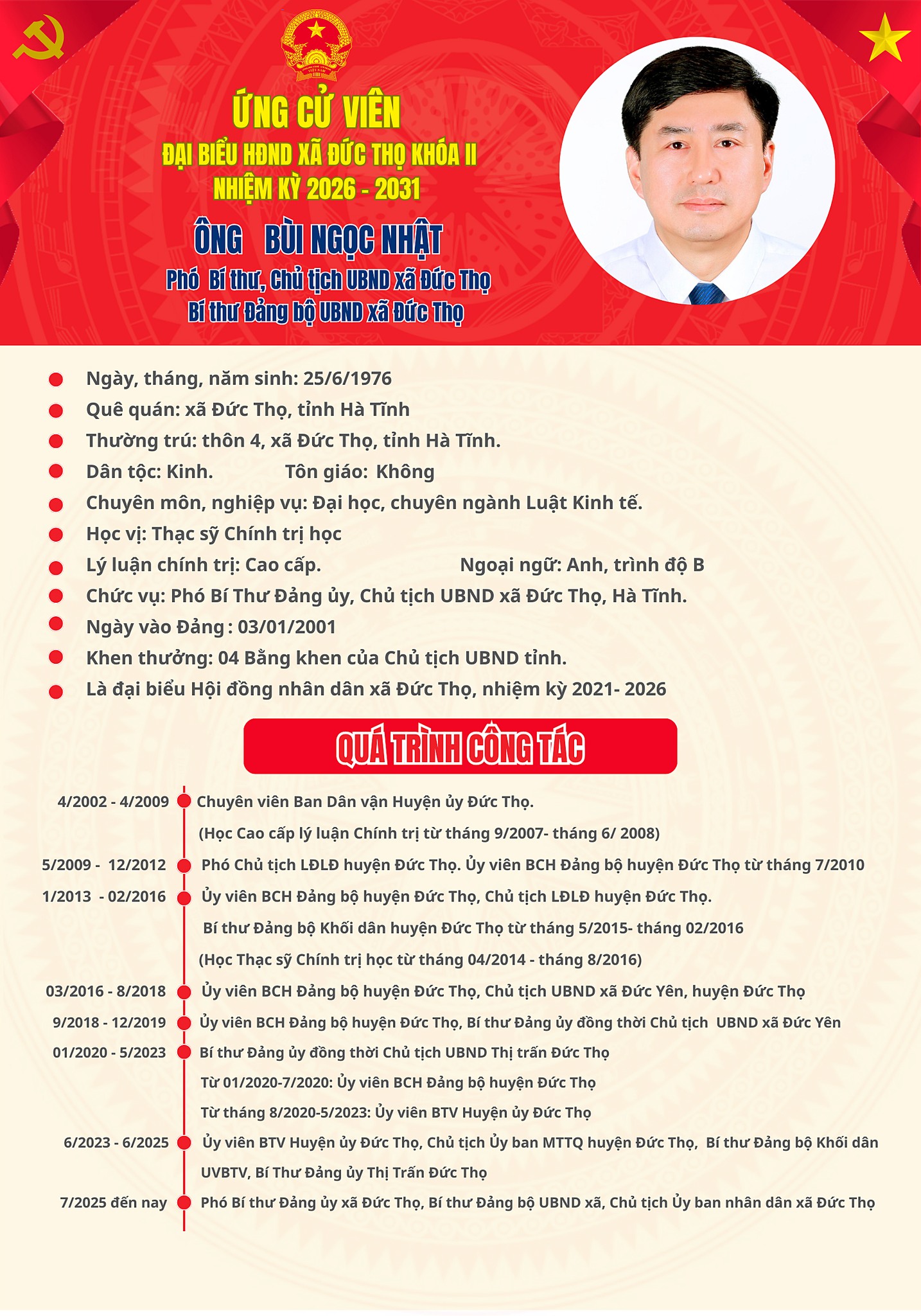 Tiểu sử ứng cử viên đại biểu HĐND xã Đức Thọ khóa II Bùi Ngọc Nhật Ẩn danh01/03/2026A -A+Ẩn danh01/03/2026A -A+