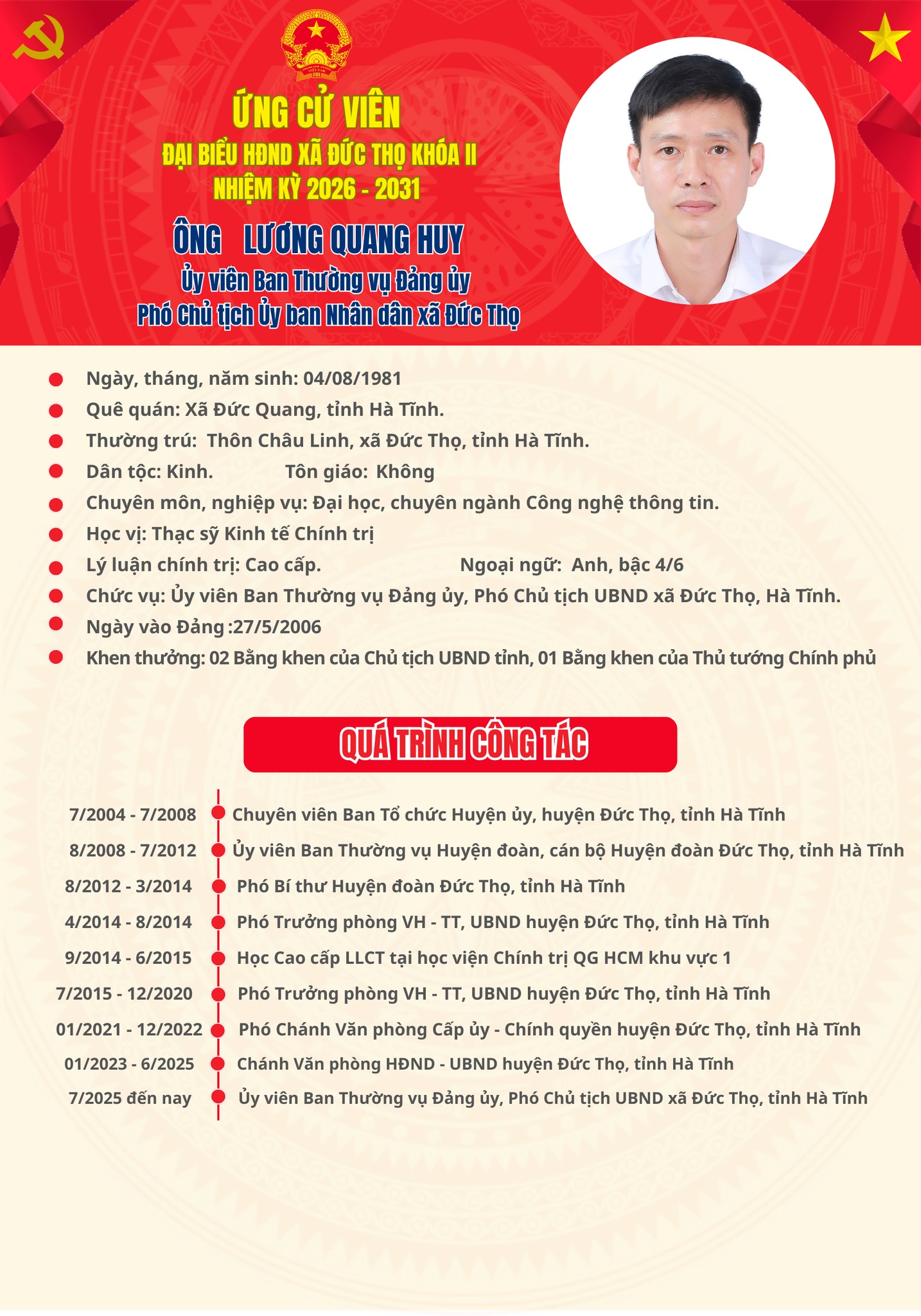 Tiểu sử ứng cử viên đại biểu HĐND xã Đức Thọ khóa II Lương Quang Huy Ngọc Luyến01/03/2026A -A+Ngọc Luyến01/03/2026A -A+