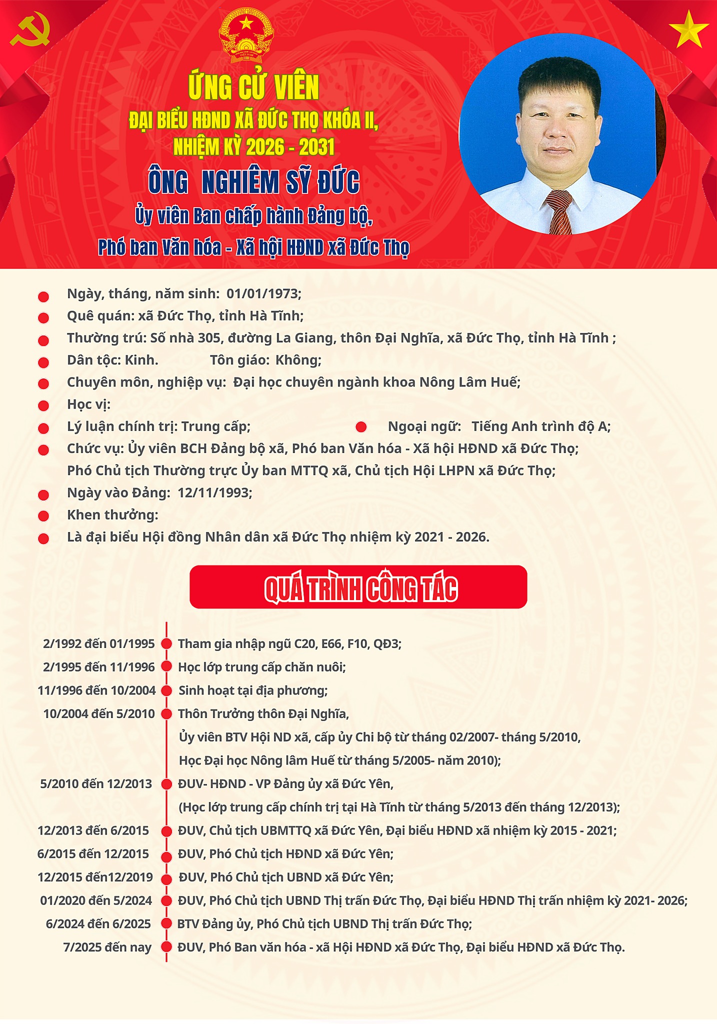 Tiểu sử ứng cử viên đại biểu HĐND xã Đức Thọ khóa II Nghiêm Sỹ Đức Ngọc Luyến03/03/2026A -A+Ngọc Luyến03/03/2026A -A+