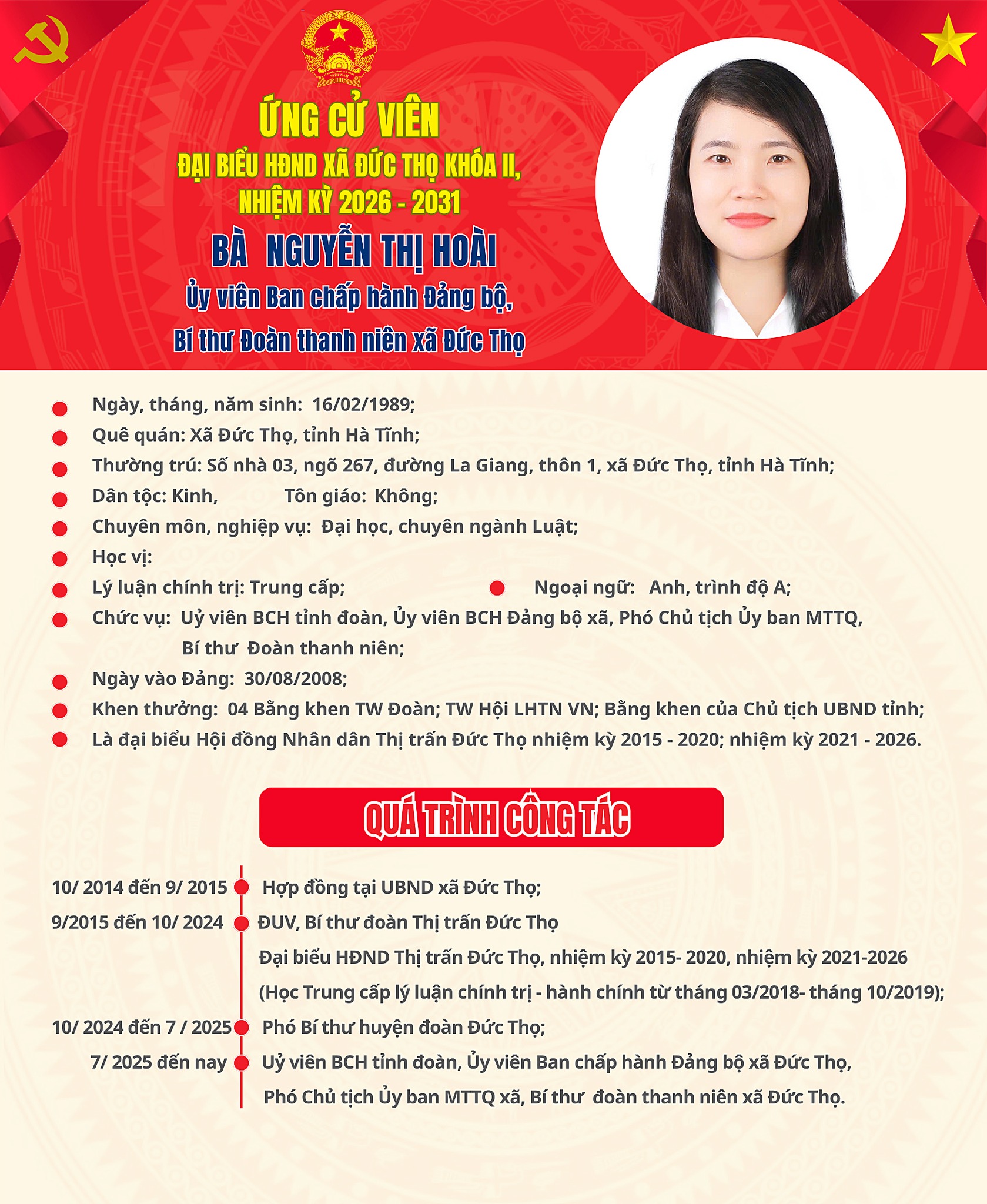 Tiểu sử ứng cử viên đại biểu HĐND xã Đức Thọ khóa II Nguyễn Thị Hoài Ẩn danh03/03/2026A -A+Ẩn danh03/03/2026A -A+