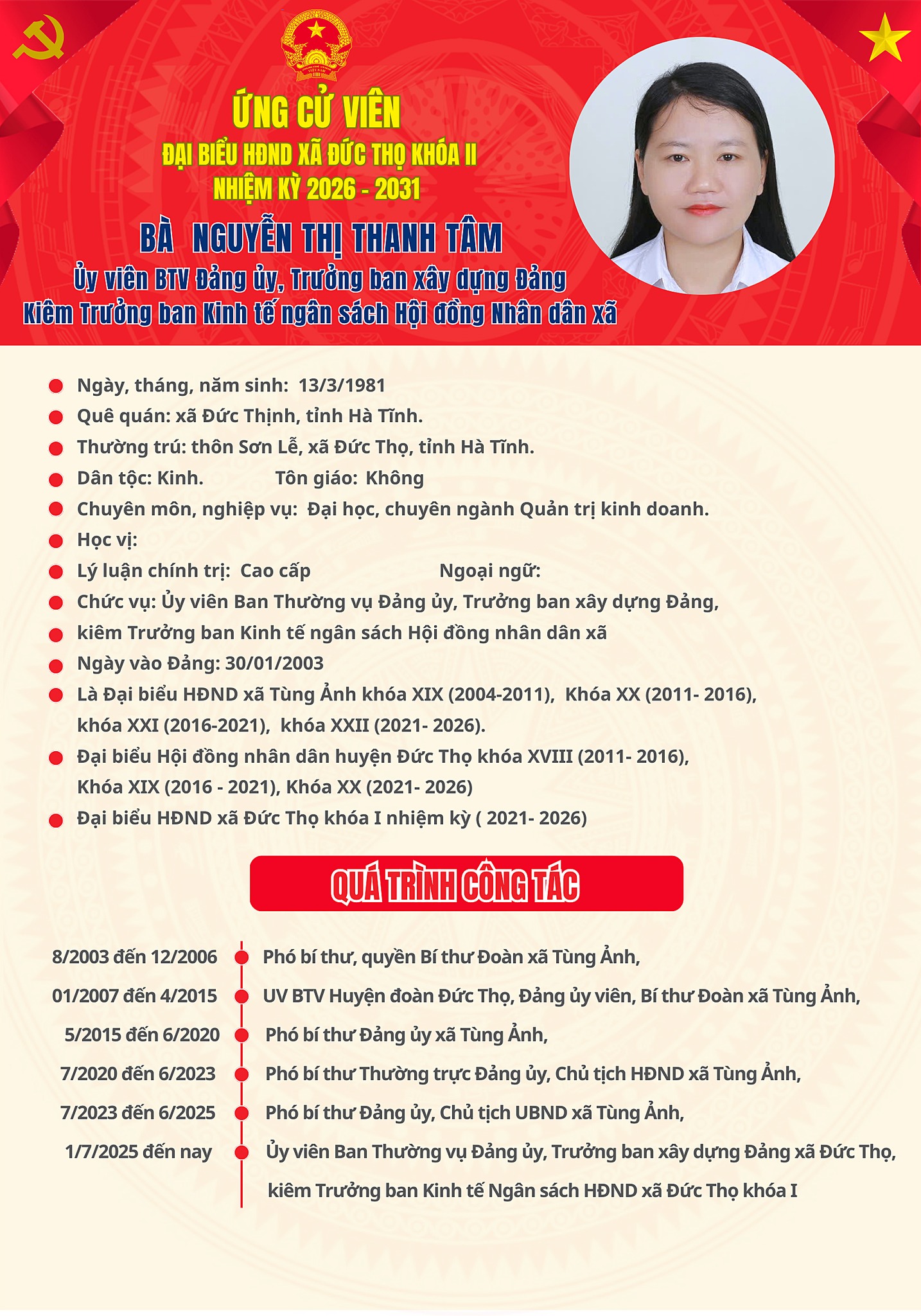 Tiểu sử ứng cử viên đại biểu HĐND xã Đức Thọ khóa II Nguyễn Thị Thanh Tâm Ngọc Luyến02/03/2026A -A+Ngọc Luyến02/03/2026A -A+
