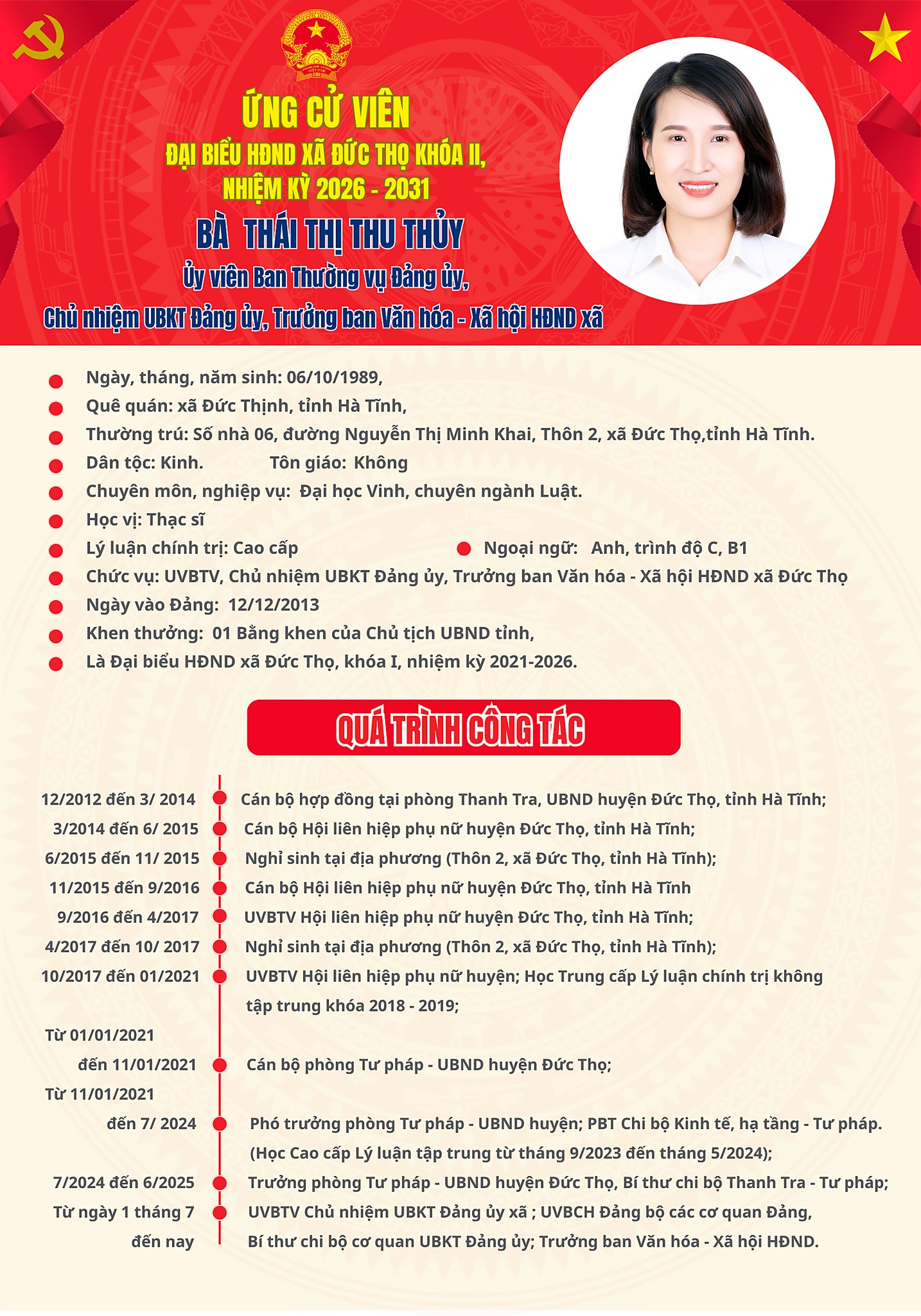 Tiểu sử ứng cử viên đại biểu HĐND xã Đức Thọ khóa II Thái Thị Thu Thủy Ngọc Luyến02/03/2026A -A+Ngọc Luyến02/03/2026A -A+