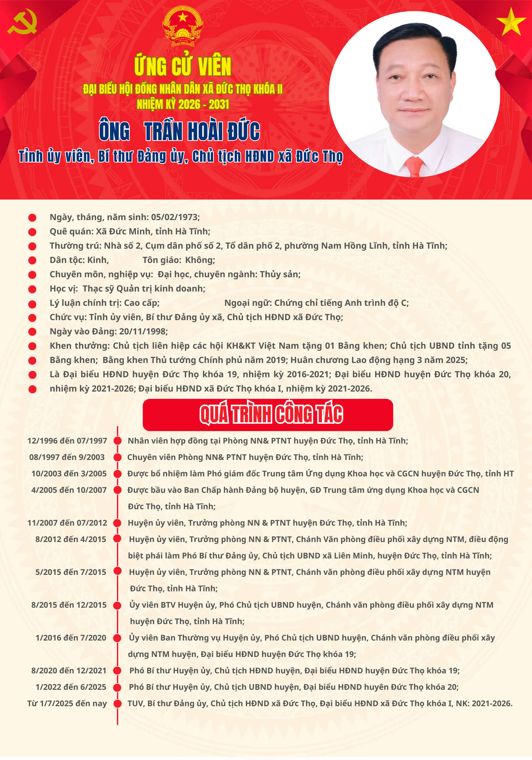 Tiểu sử ứng cử viên đại biểu HĐND xã Đức Thọ khóa II Trần Hoài ĐứcNgọc Luyến01/03/2026A -A+Ngọc Luyến01/03/2026A -A+