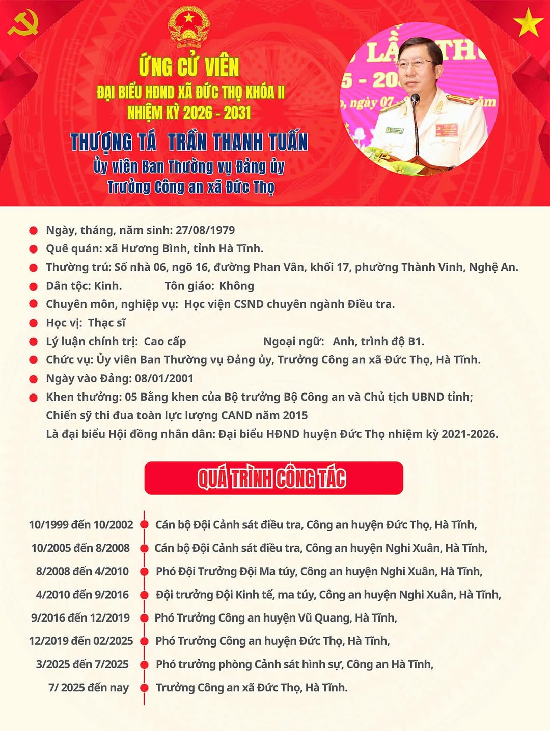 Tiểu sử ứng cử viên đại biểu HĐND xã Đức Thọ khóa II Trần Thanh Tuấn Ngọc Luyến01/03/2026A -A+Ngọc Luyến01/03/2026A -A+