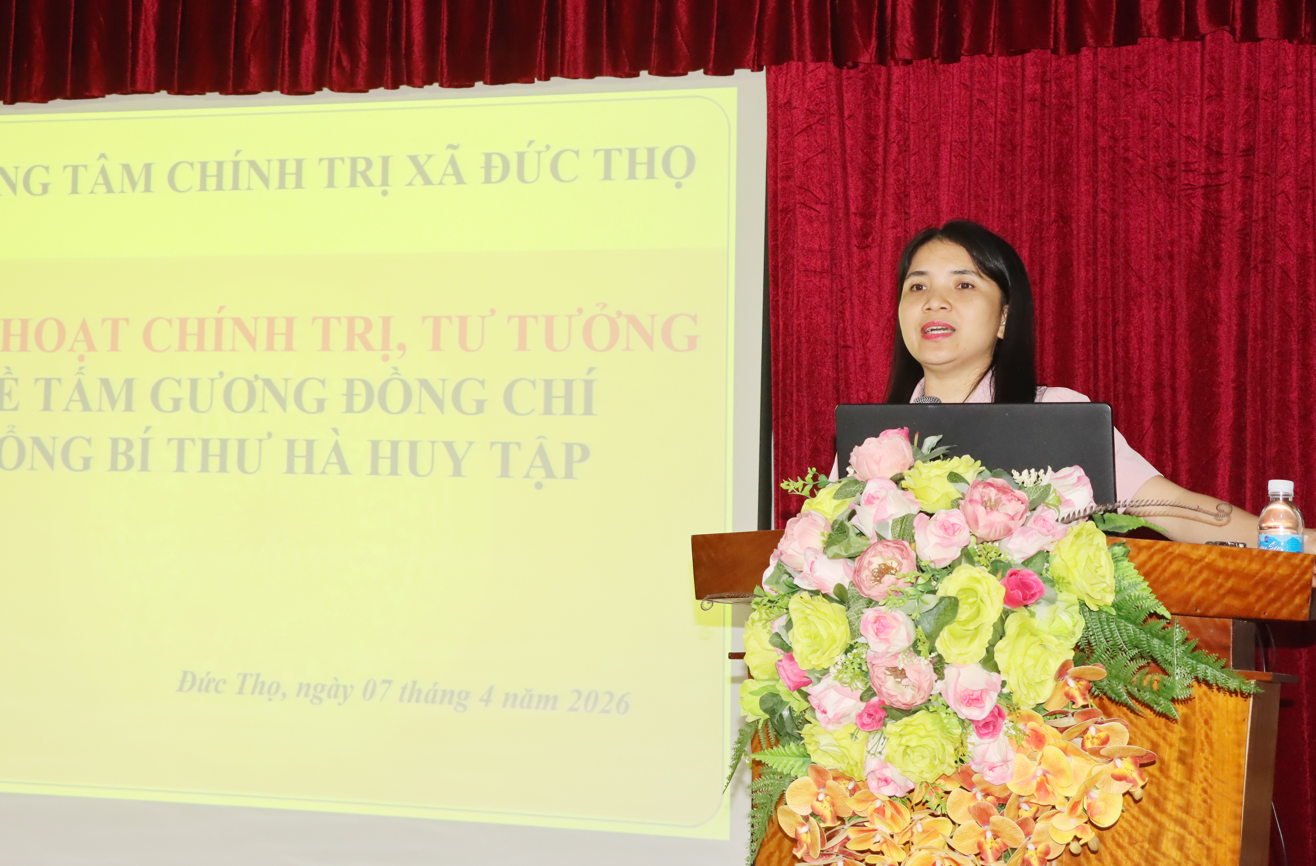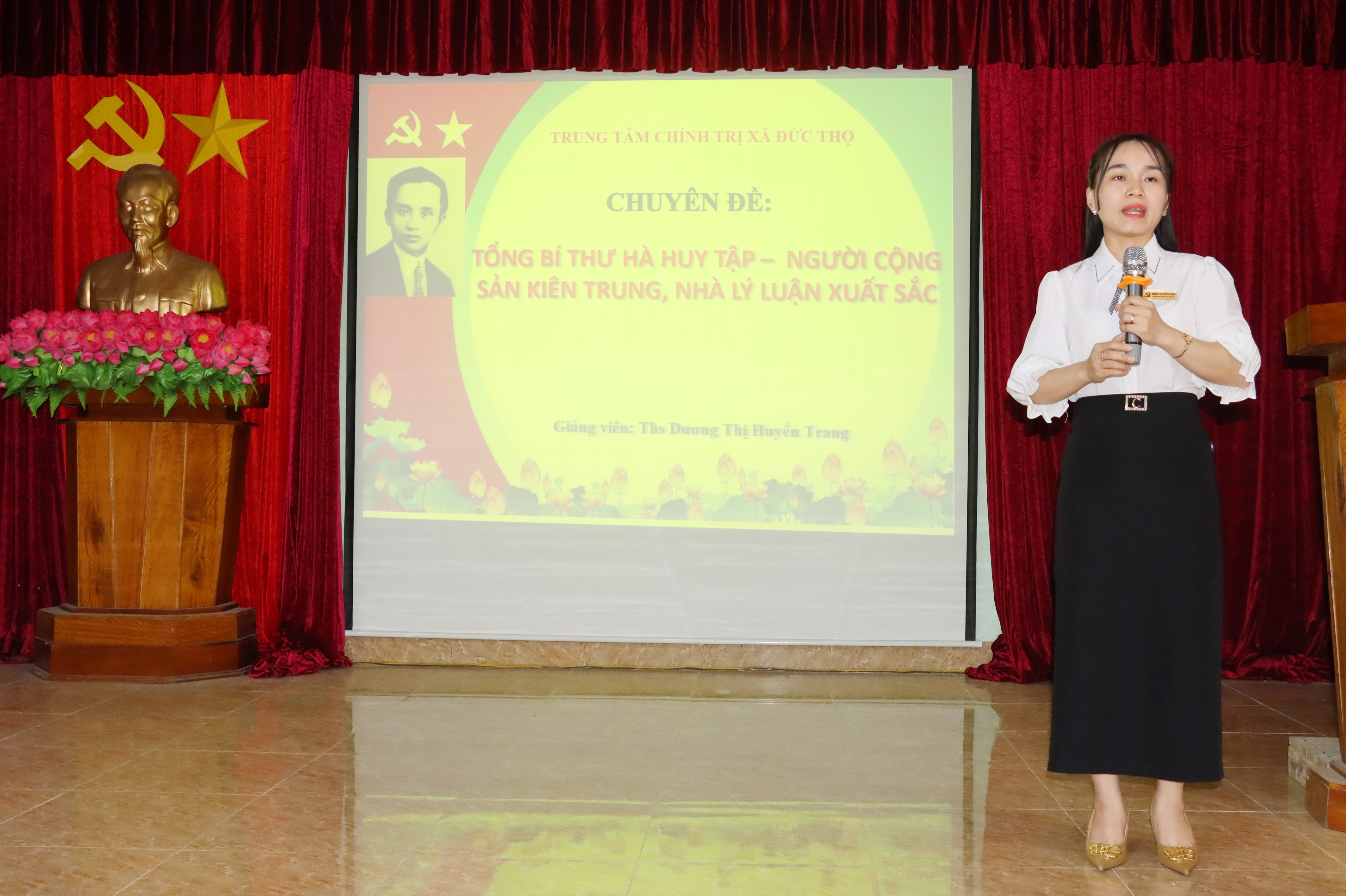 Đồng chí Dương Thị Huyền Trang - Phó Giám đốc Trung tâm Chính trị xã Đức Thọ triển khai chuyên đề về thân thế, sự nghiệp, cuộc đời hoạt động cách mạng của Tổng Bí thư Hà Huy Tập.