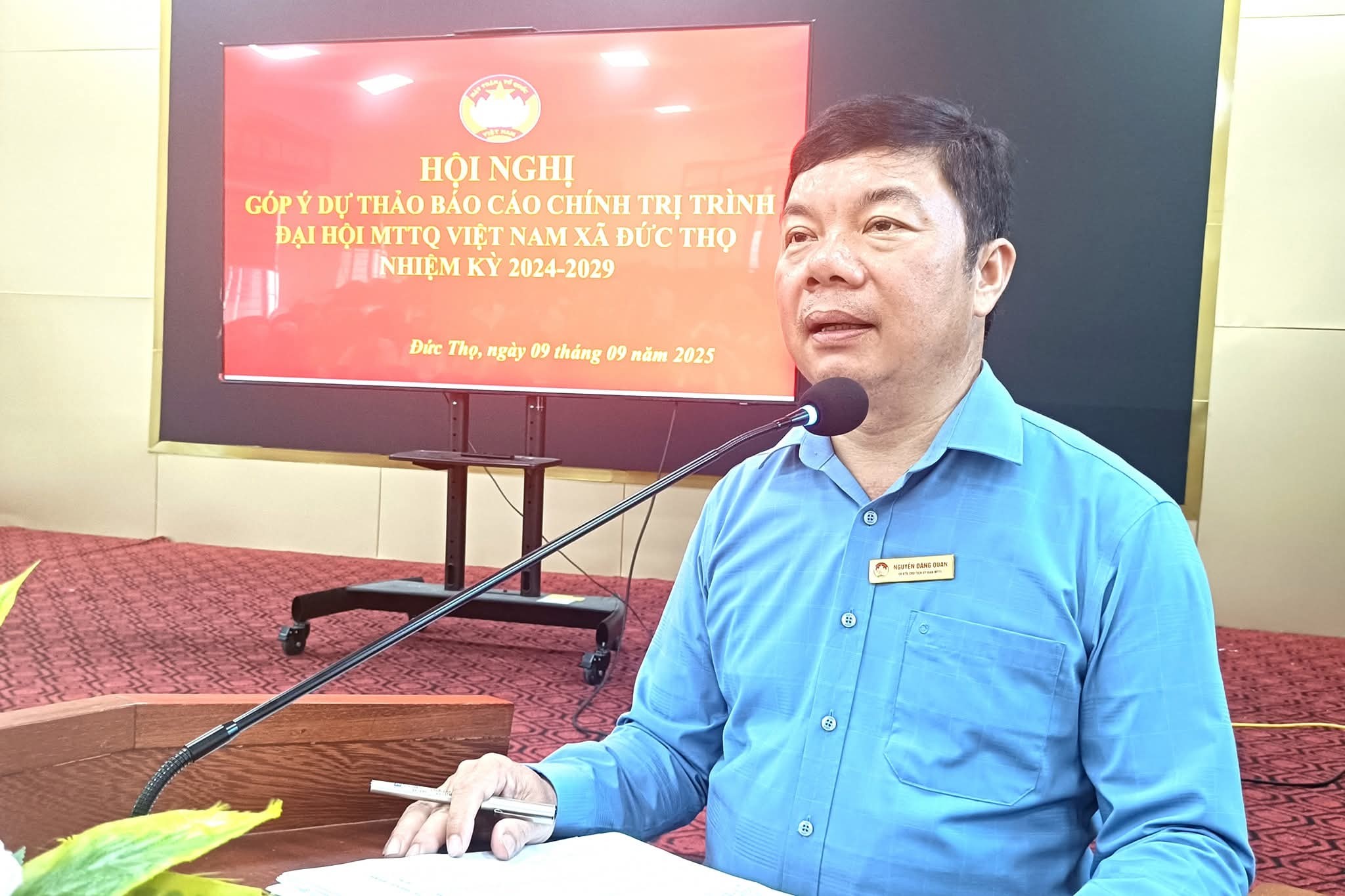 Đánh giá kết quả công tác Mặt trận trong tháng 7, tháng 8/2025; Triển khai nhiệm vụ trong thời gian tới; Góp ý dự thảo Báo cáo chính trị trình Đại hội MTTQ Việt Nam xã Đức Thọ nhiệm kỳ 2025 – 2030.