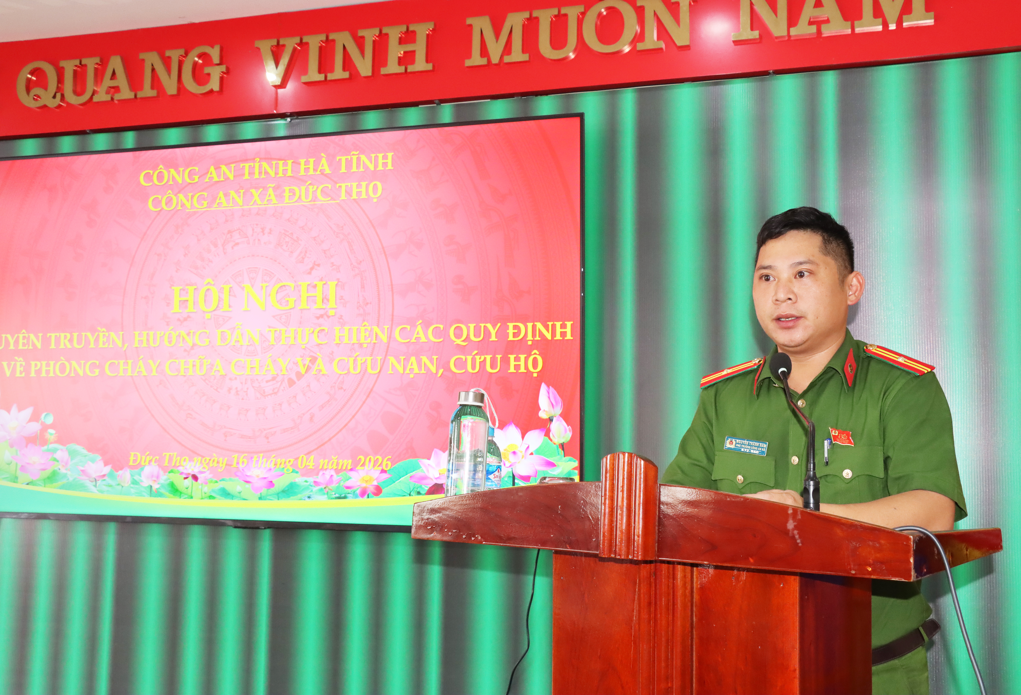 Đặt vấn đề đại diện lãnh đạo Công an xã Đức Thọ đã thông tin tình hình cháy, nổ thời gian qua trên địa bàn tỉnh Hà Tĩnh và địa bàn xã; phân tích nguyên nhân, điều kiện phát sinh cháy, nổ, cứu nạn, cứu hộ từ đó nhấn mạnh vai trò, trách nhiệm của người đứng đầu cơ sở trong công tác PCCC .