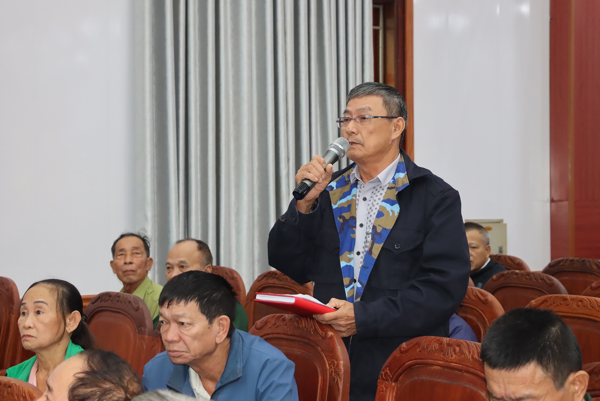 Ông Lê Minh Tương - Chi hội trưởng Hội người cao tuổi thôn Long Sơn trao đổi về nội dung chính sách, tổ chức hội.