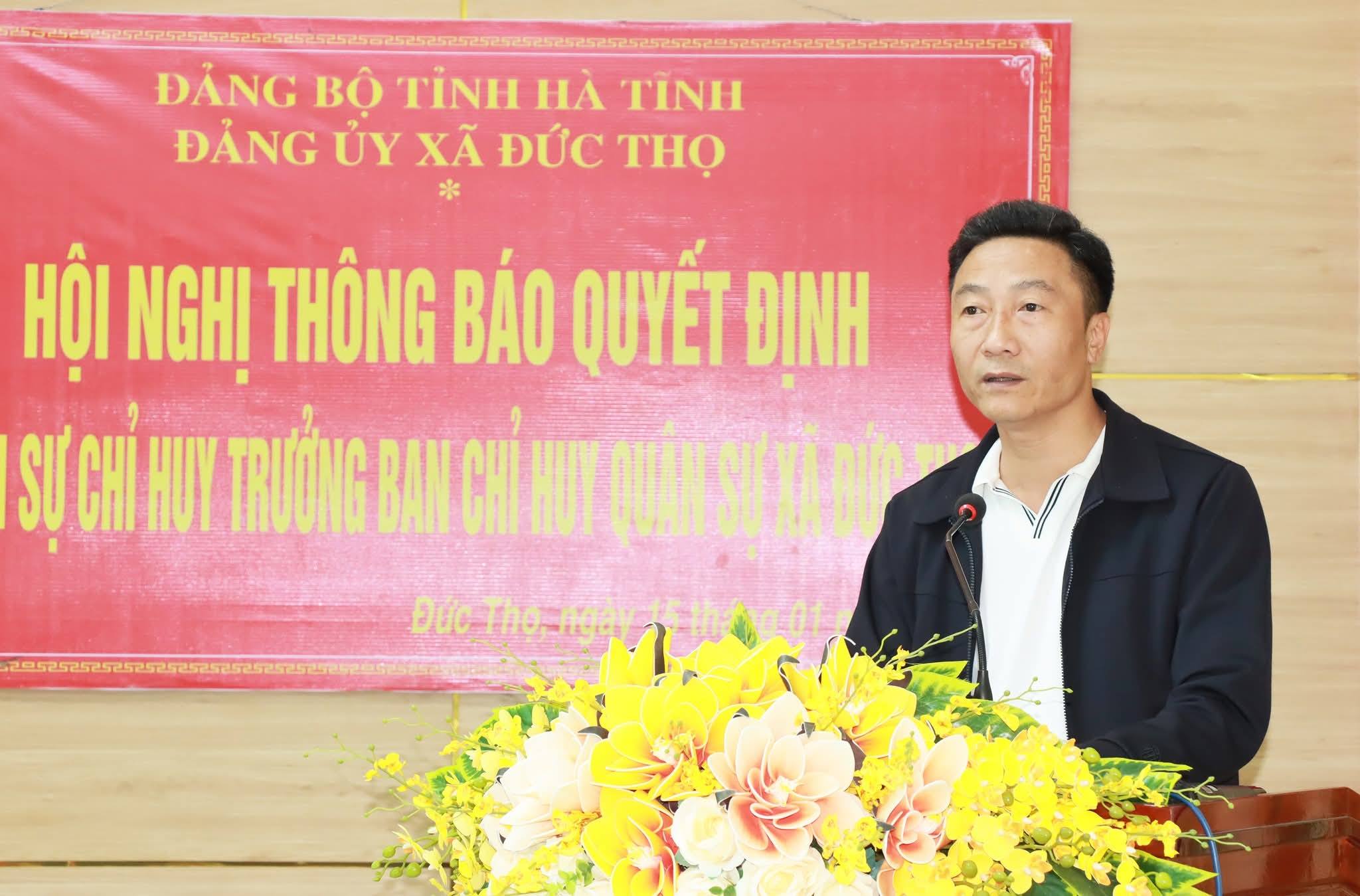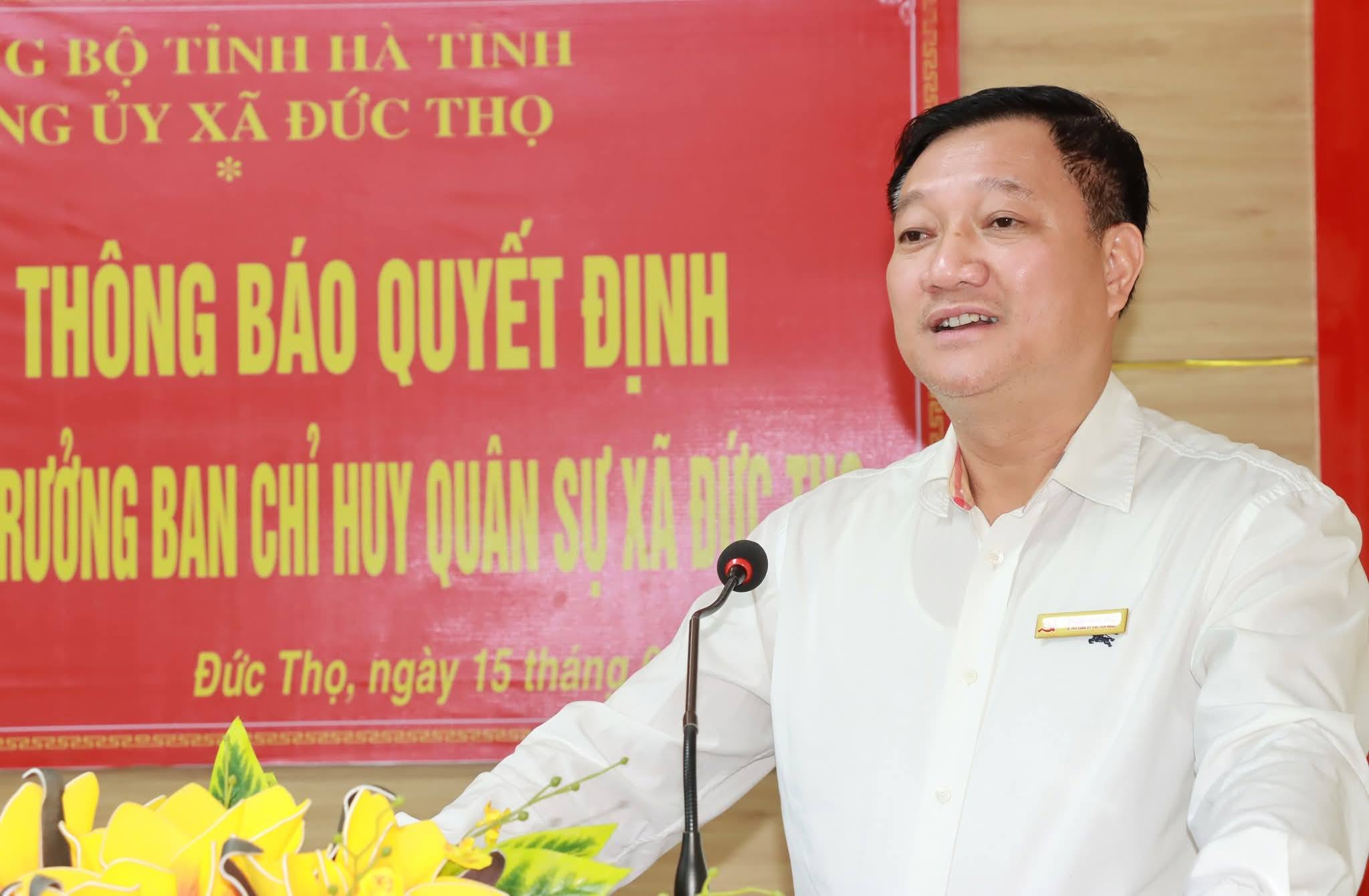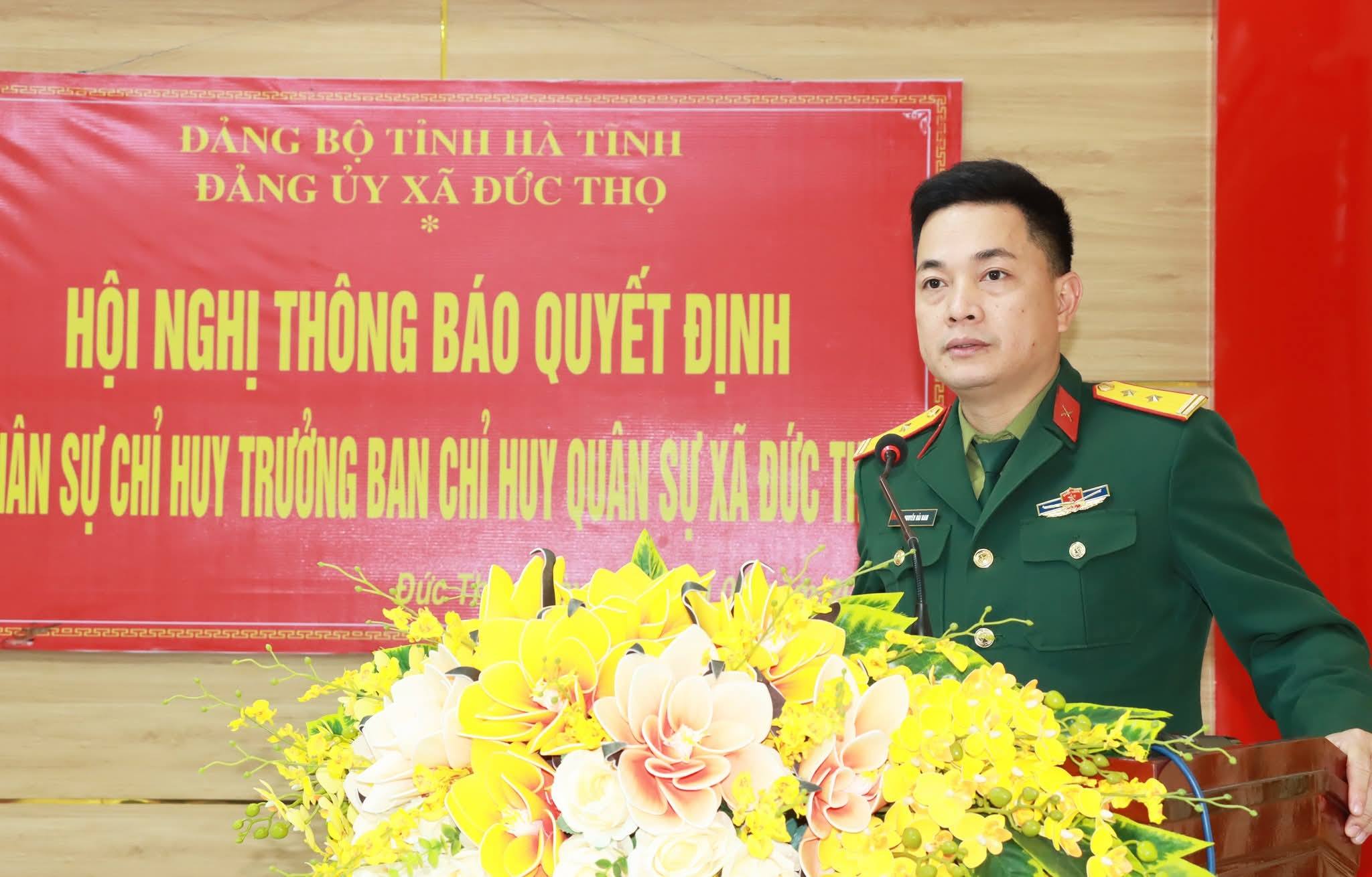 Giao nhiệm vu tại hội nghị, TUV-Bí thư Đảng ủy - Chủ tịch HĐND xã Đức Thọ Trần Hoài Đức yêu cầu đồng chí Trung tá Nguyễn Hải Nam ngay sau khi nhận nhiệm vụ cần nhanh chóng tiếp cận công việc, nắm bắt địa bàn; đoàn kết trong cấp ủy, chỉ huy đơn vị, gắn bó với nhân dân; phối hợp với các lực lượng ban, ngành làm tốt công tác tham mưu cho cấp ủy, chính quyền địa phương lãnh đạo, chỉ đạo thực hiện thắng lợi nhiệm vụ quốc phòng, quân sự địa phương thời gian tới, trước mắt là công tác tuyển chọn, gọi công dân nhập ngũ năm 2026.