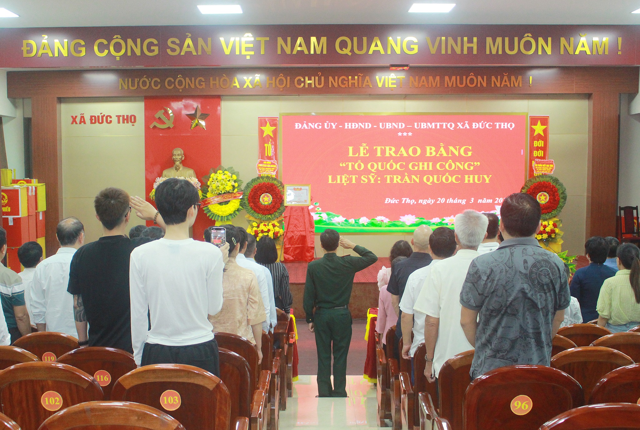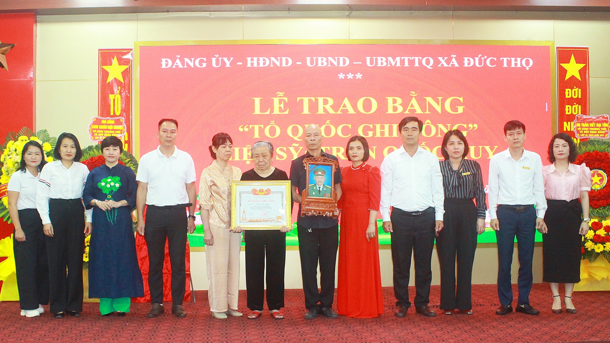 Thừa ủy quyền của Thủ tướng Chính phủ, lãnh đạo xã Đức Thọ đã trao bằng Tổ quốc ghi công cho đại diện gia đình Liệt sỹ Trần Quốc Huy. Việc trao bằng không chỉ là sự tôn vinh đối với cá nhân liệt sỹ mà còn là nguồn động viên tinh thần to lớn đối với gia đình, người thân.