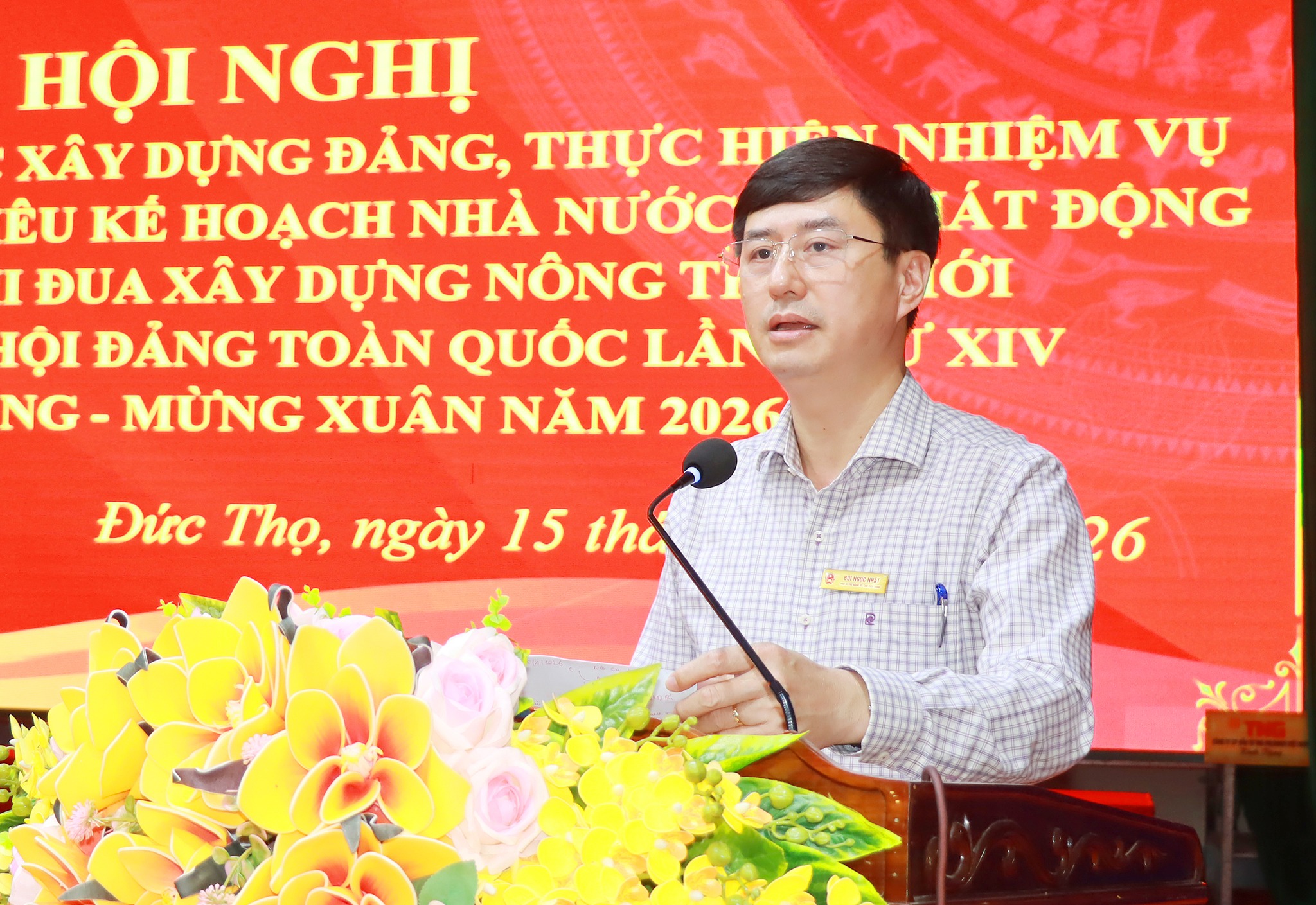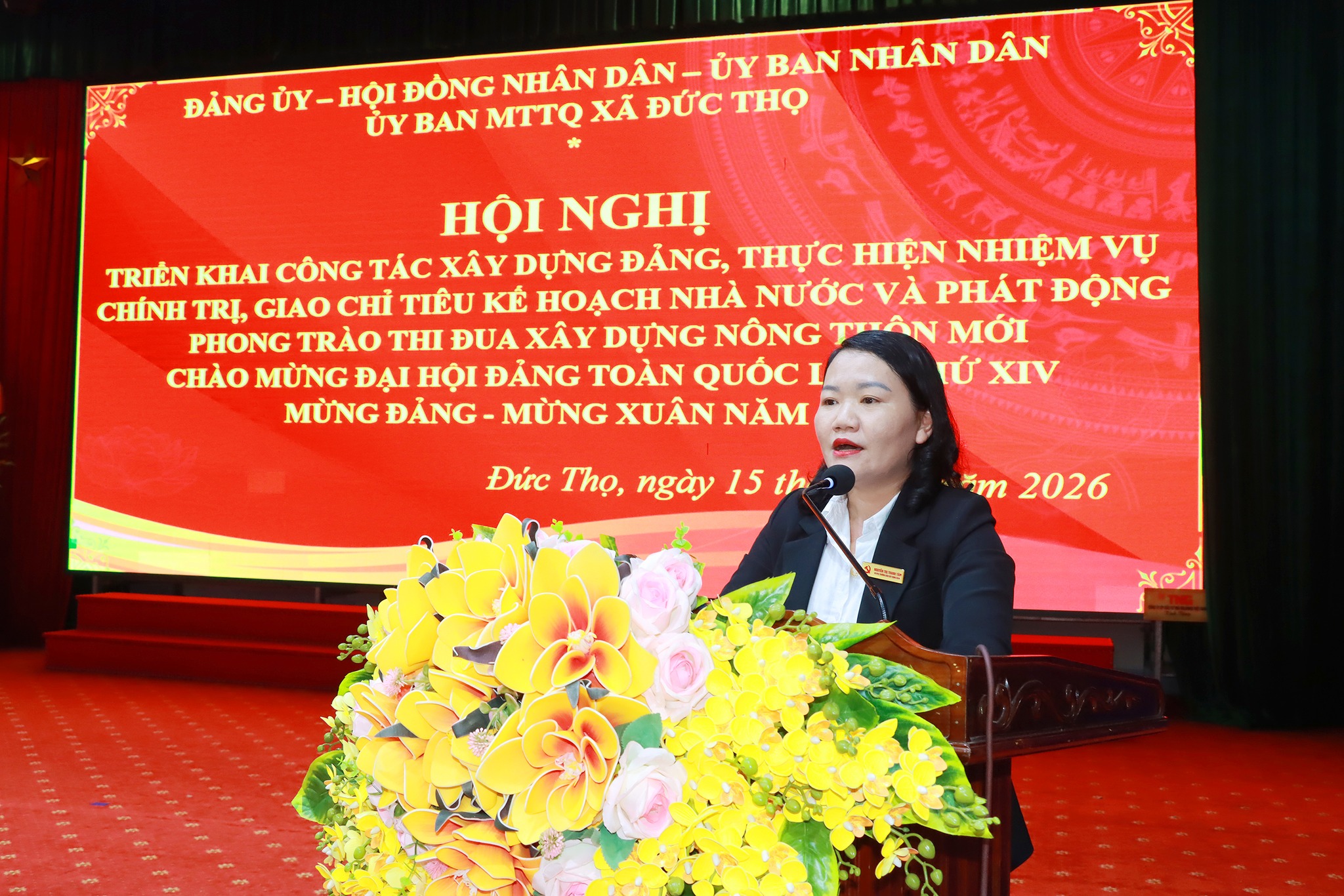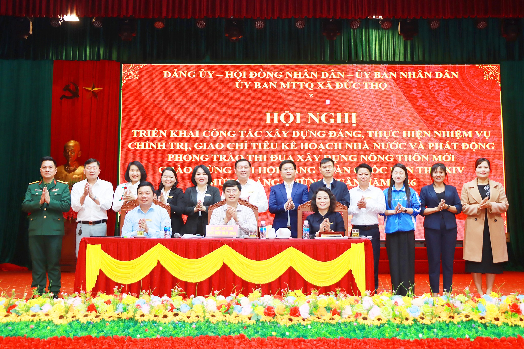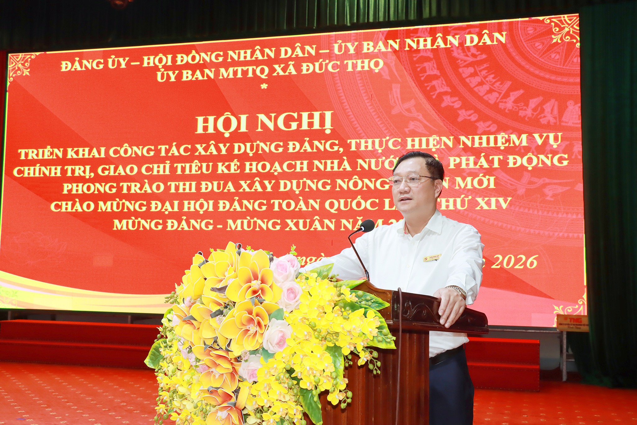 Chiều ngày 15/1/2026, Đảng ủy - HĐND - UBND - Ủy ban MTTQ xã Đức Thọ tổ chức Hội nghị triển khai công tác xây dựng Đảng, thực hiện nhiệm vụ chính trị, giao chỉ tiêu kế hoạch Nhà nước và phát động phong trào thi đua xây dựng Nông thôn mới, chào mừng Đại hội Đảng toàn quốc lần XIV, mừng Đảng mừng Xuân năm 2026.
